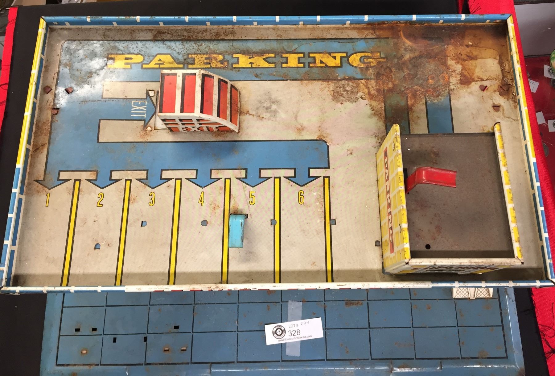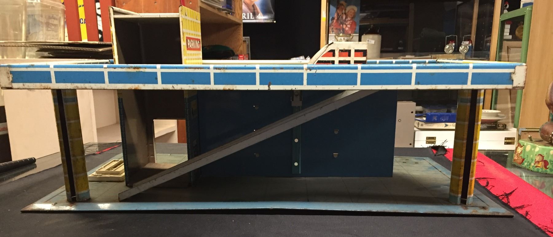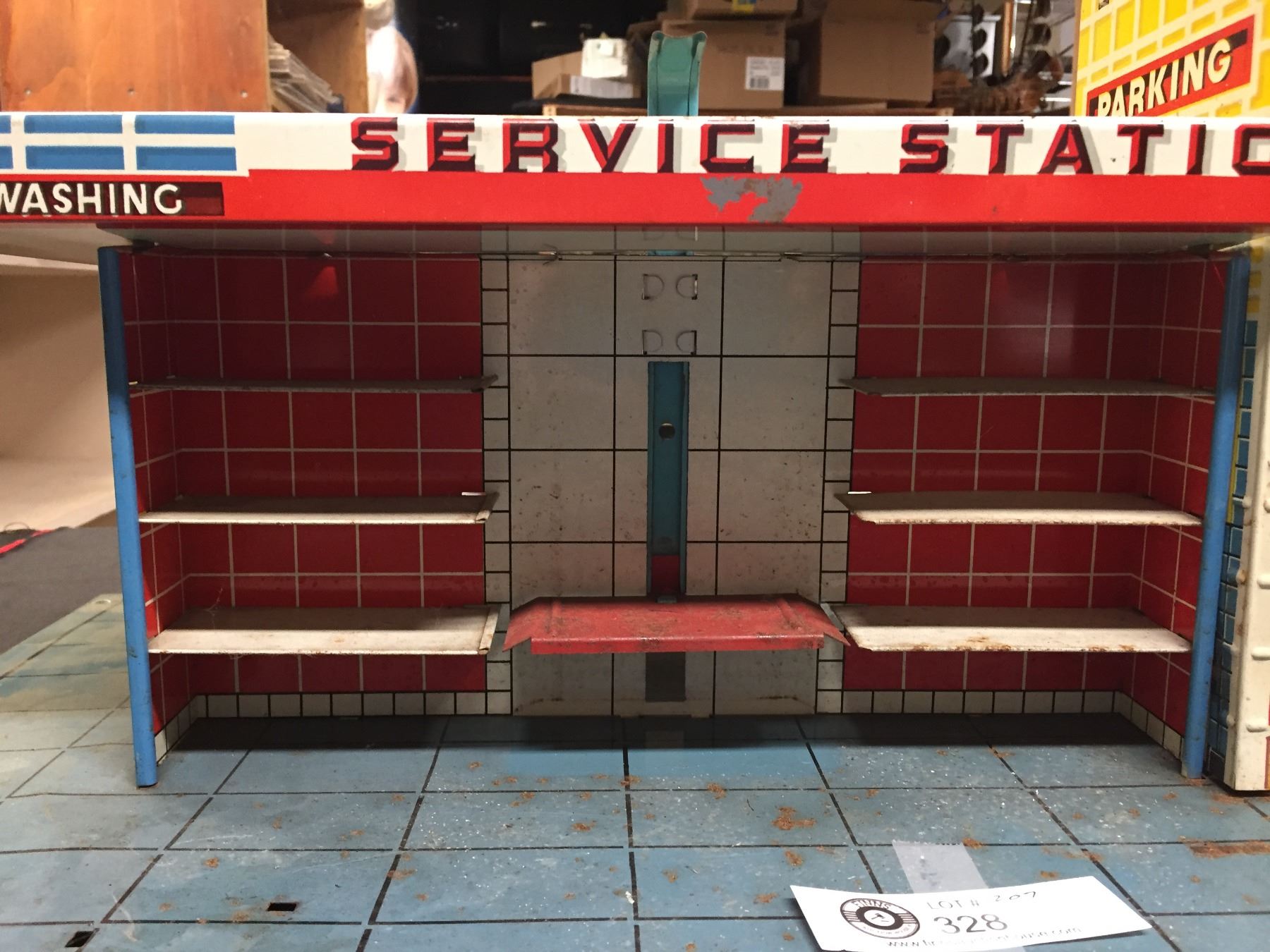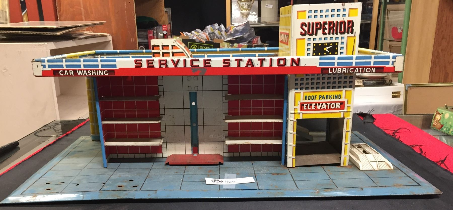 Vintage 1950’s Tin Litho Marx Service Station Center. Elevator for Roof Top Park 25 w x 12 H x 15 D