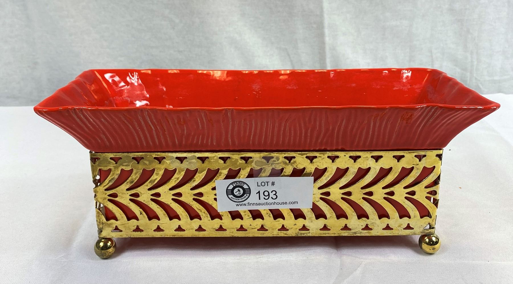 Vintage 1955 Poppy Red California Pottery Planter In Brass Caddy, Approx. 8" Tall