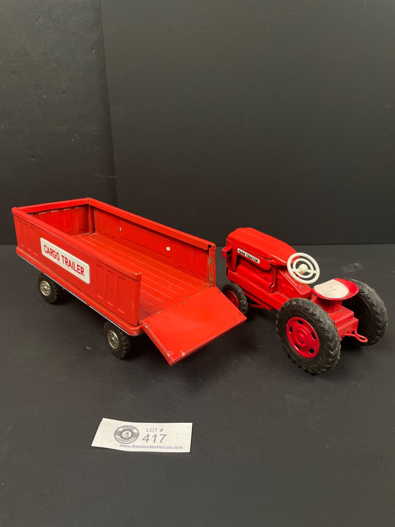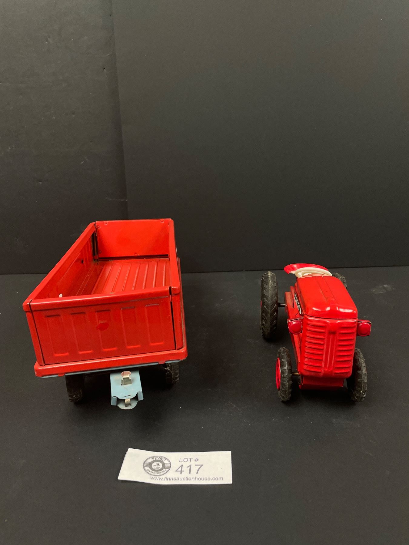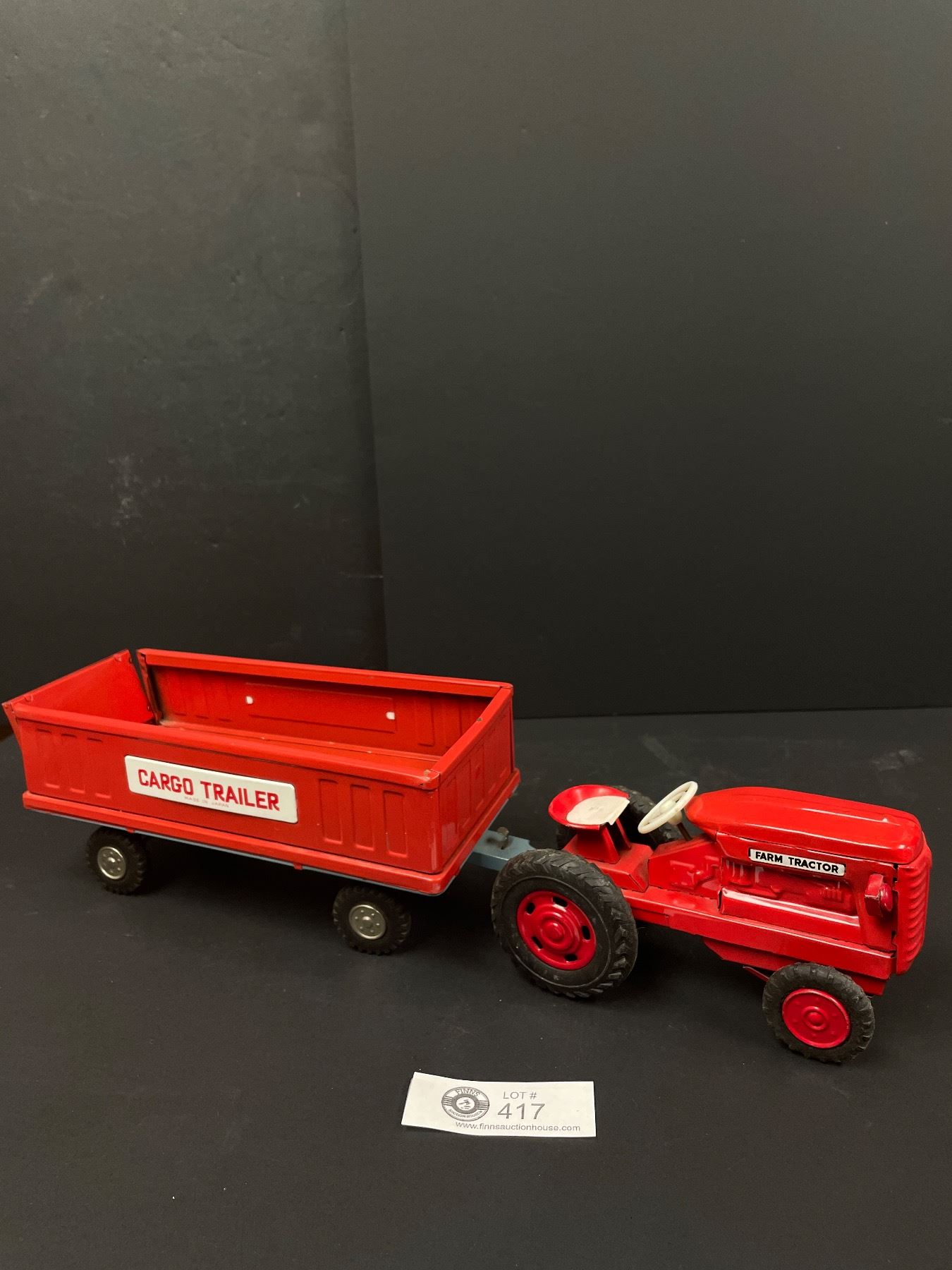 Vintage 1960s Tin Friction Farm Tractor with Cargo Trailer Toy Set #1417, Made in Kyoei, Japan