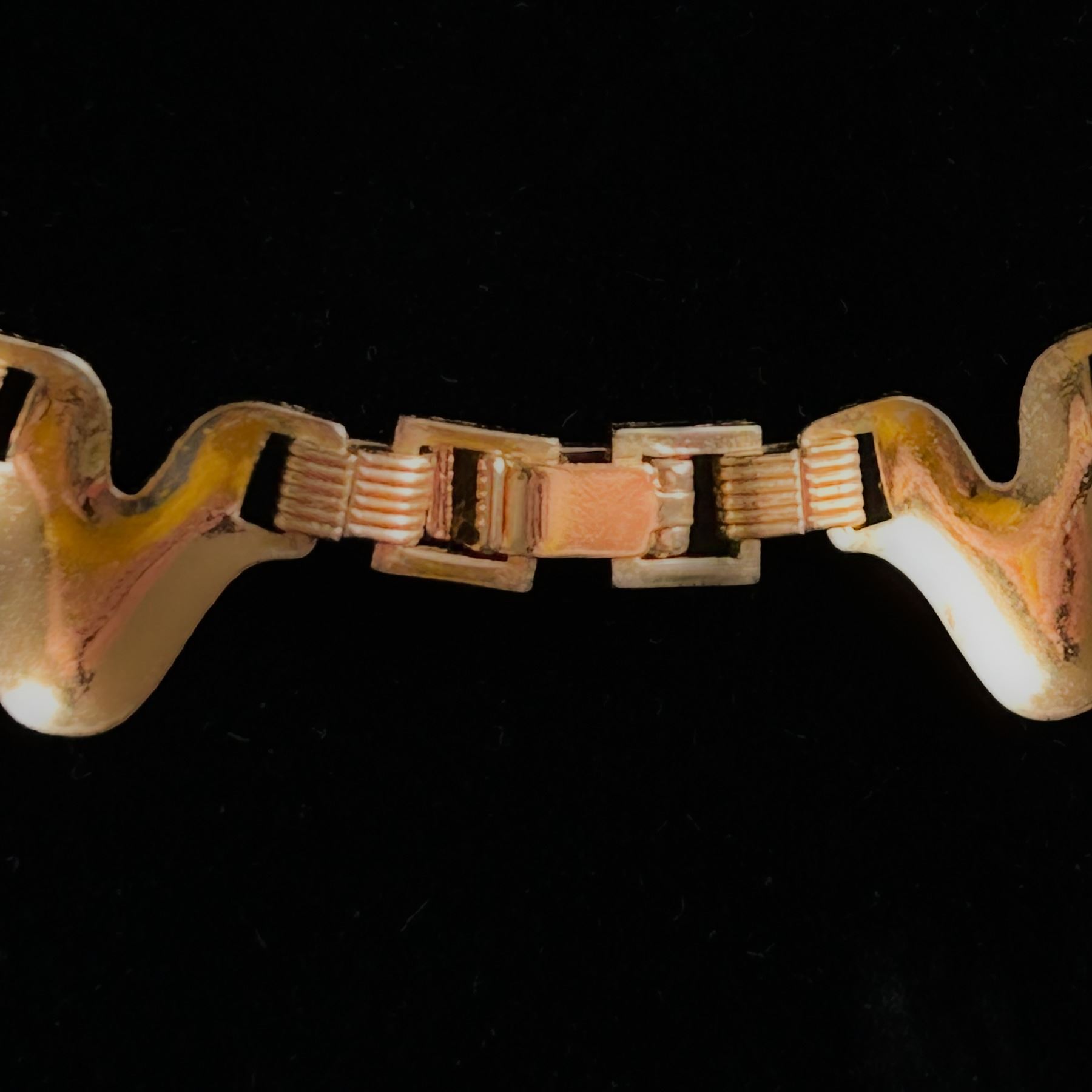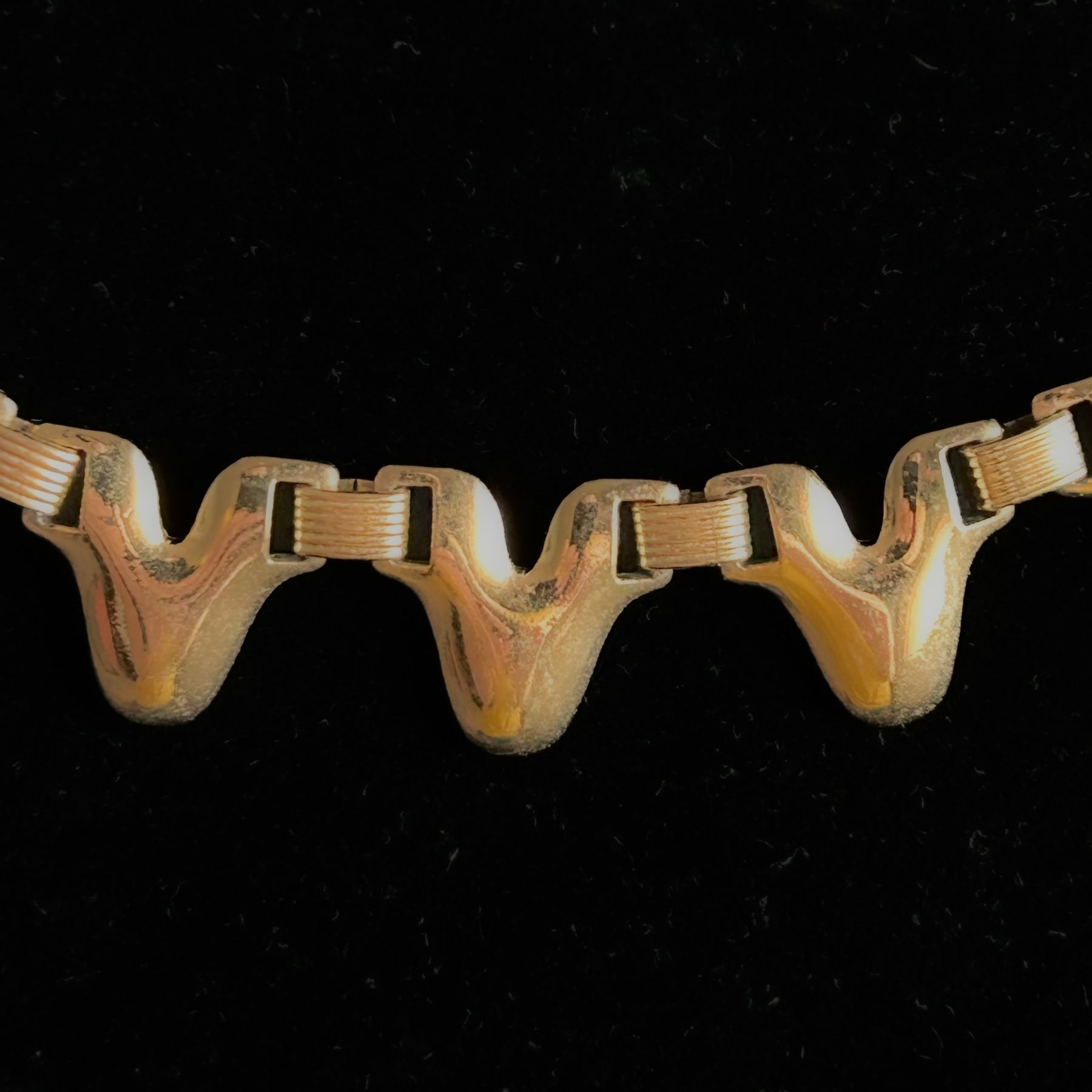 Striking vintage gold tone necklace from the 1980s with zigzag sculptural links and a box clasp. High-quality construction with smooth and ribbed detailing.