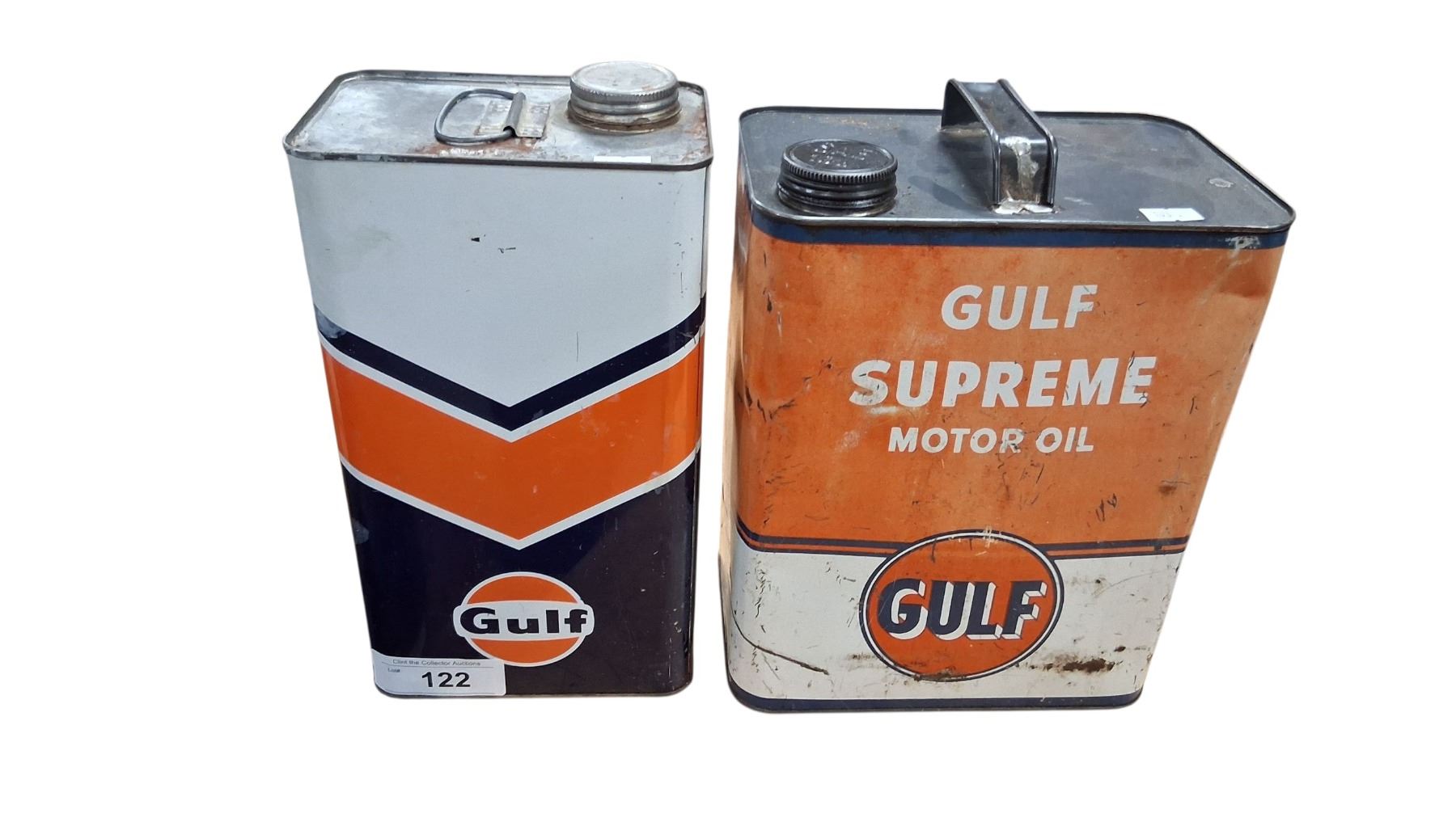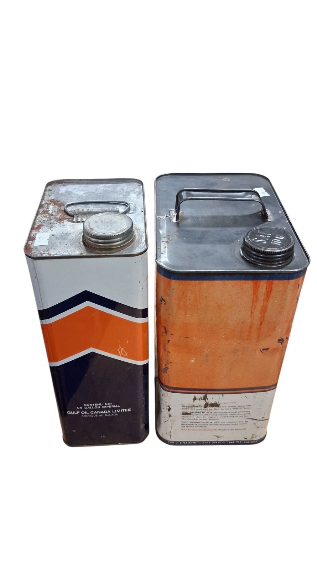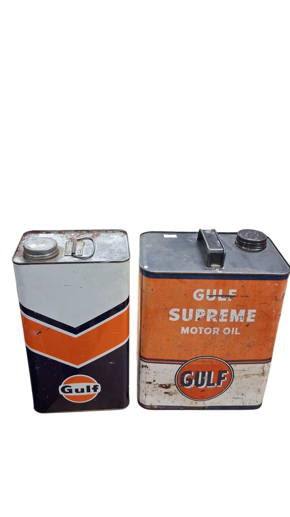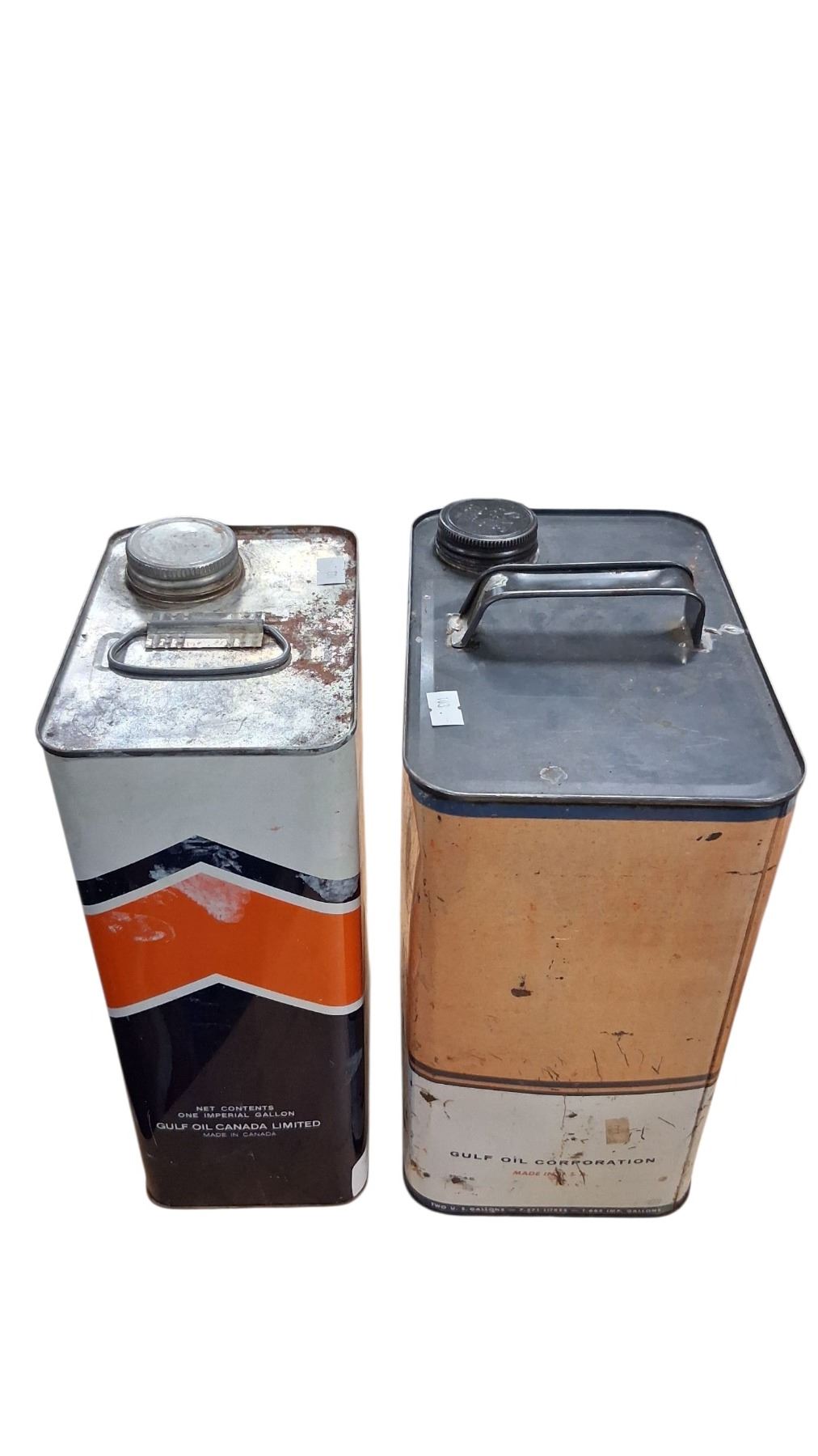 Vintage 2 US gallon Gulf oil tin & vintage 1 gallon Gulf oil tin