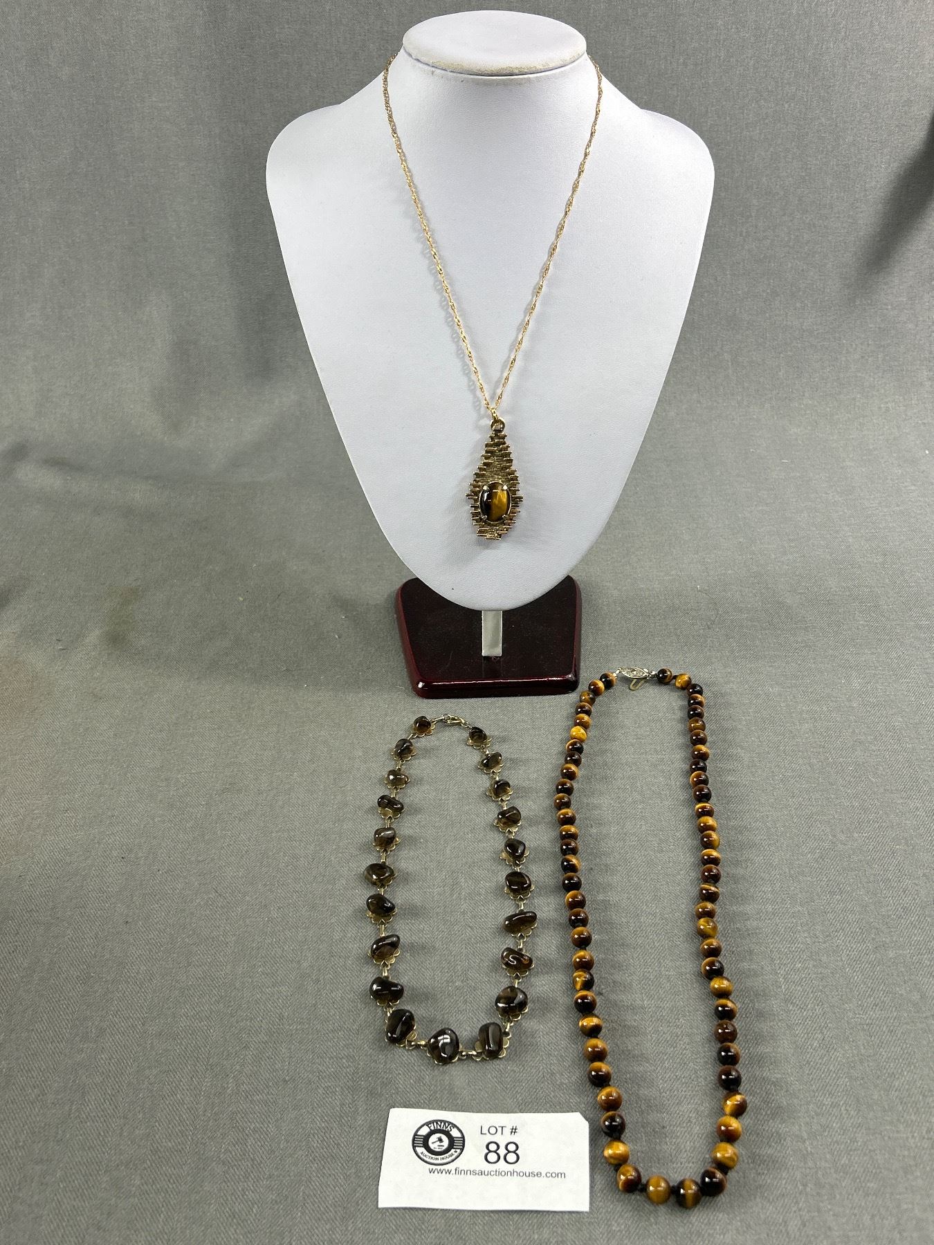 Vintage 22" Tiger's Eye Beaded Necklace, Gold Tone 18" Necklace w/ 2.5" Tiger's Eye Pendant & 16" Stone & Metal Link Necklace