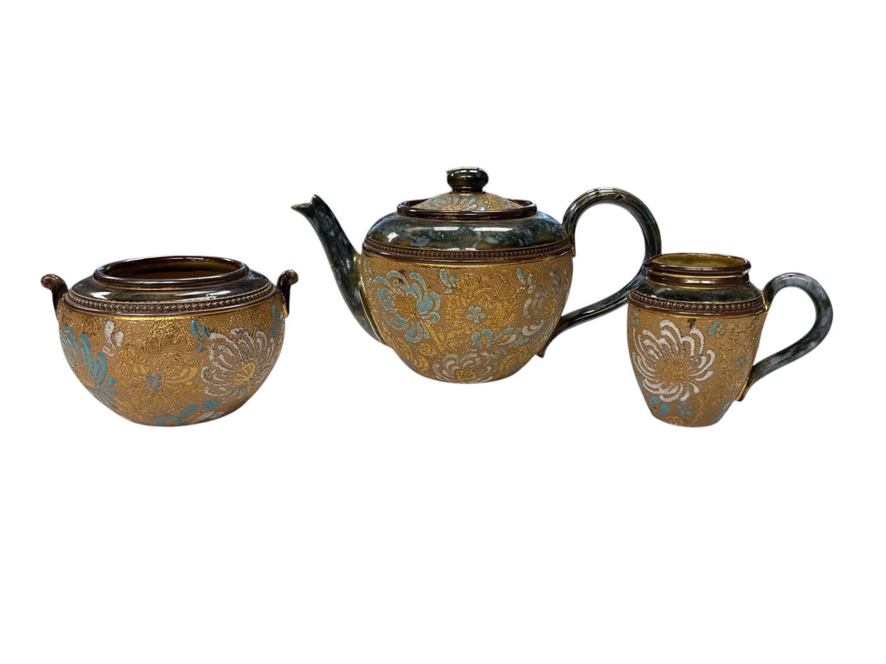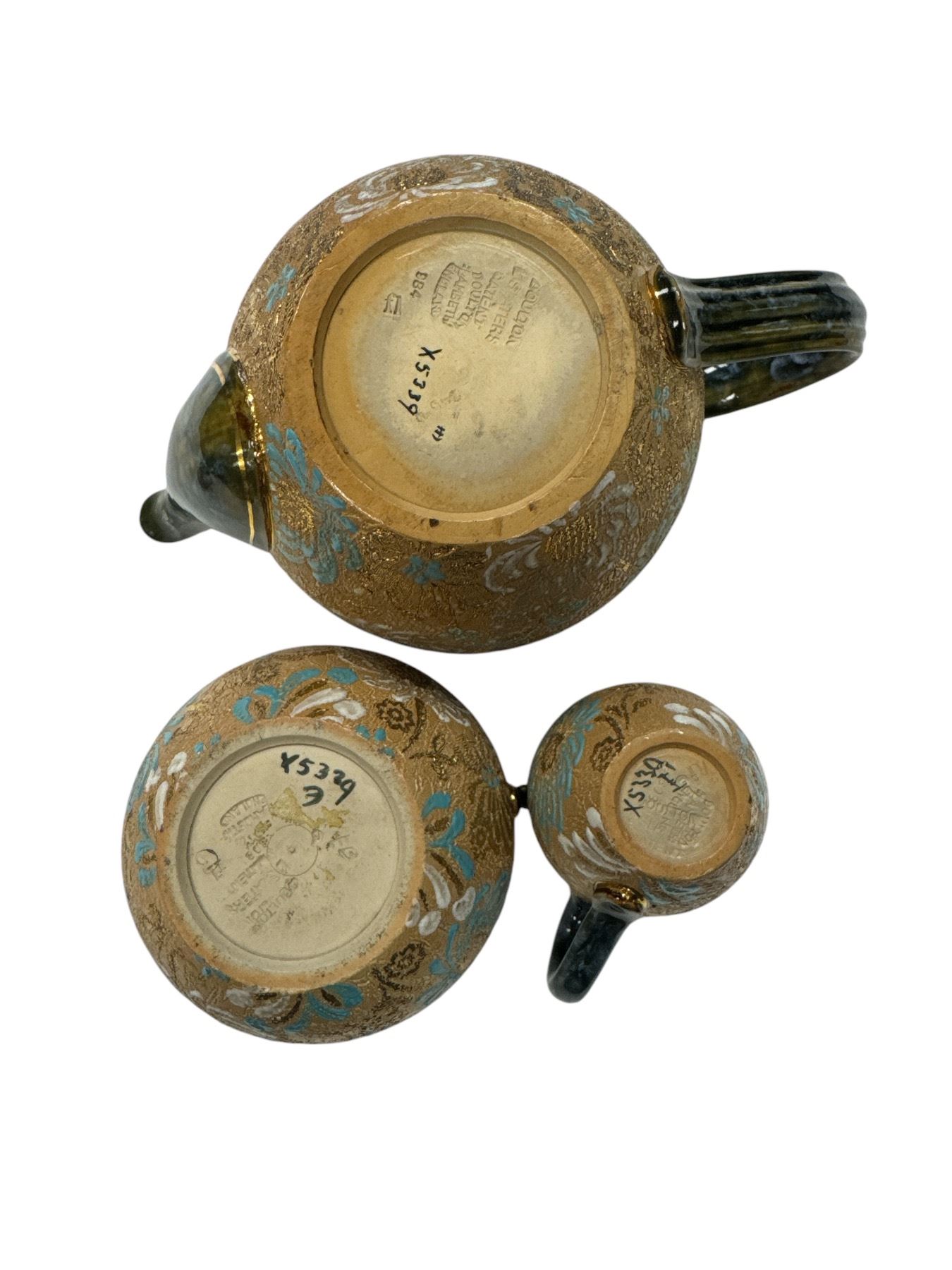 Vintage 3pcs Of Doulton Lambeth Pottery Hand Painted Teapot Set: Teapot, Creamer & Sugar Jar