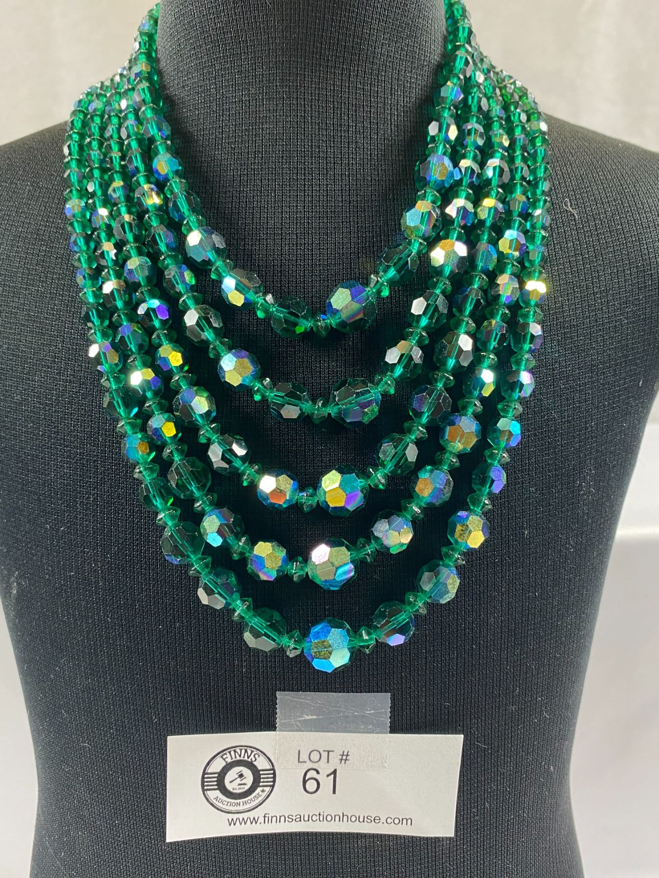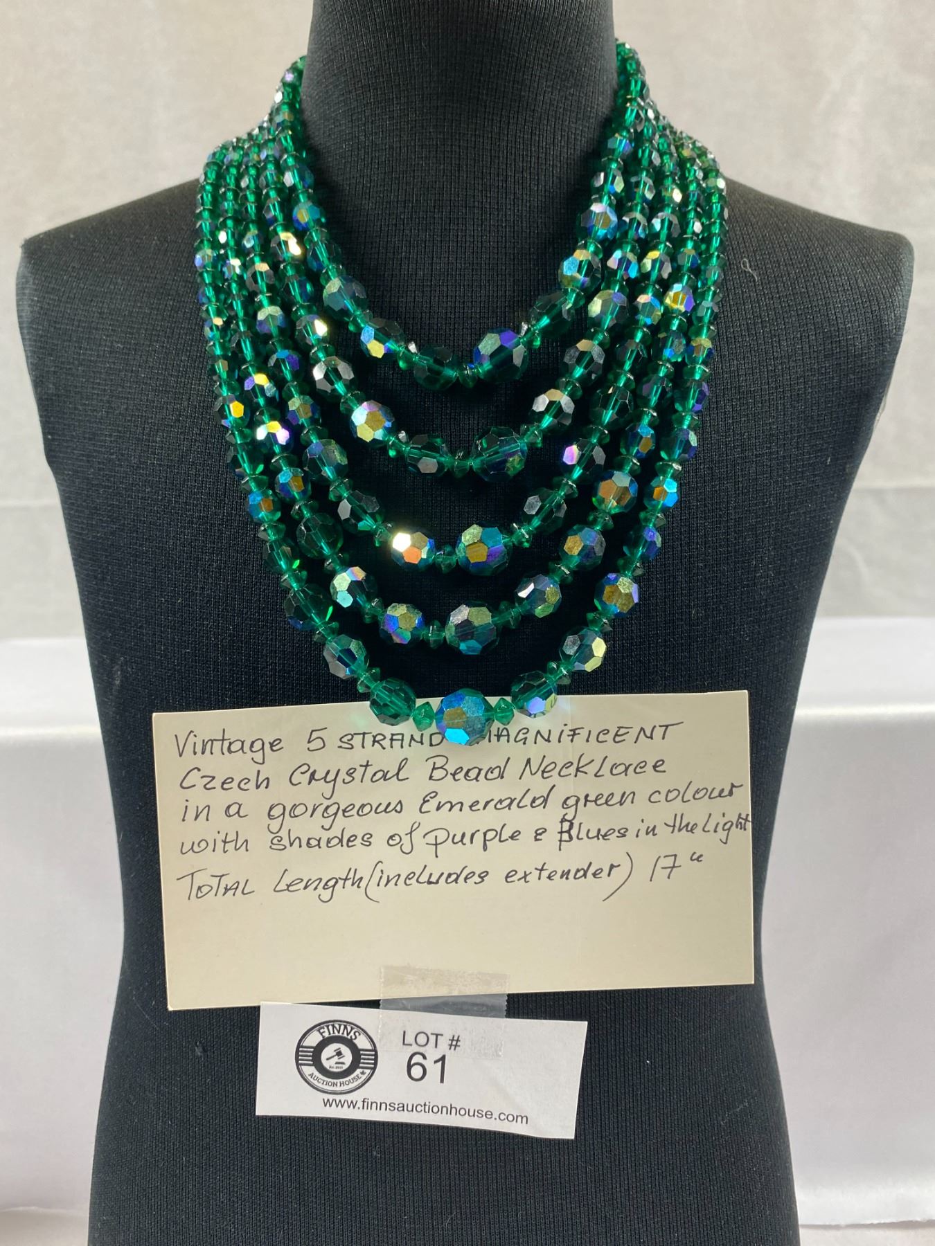 Vintage 5 Strand Czech Crystal Bead Necklace Emerald green colour 17'' long
