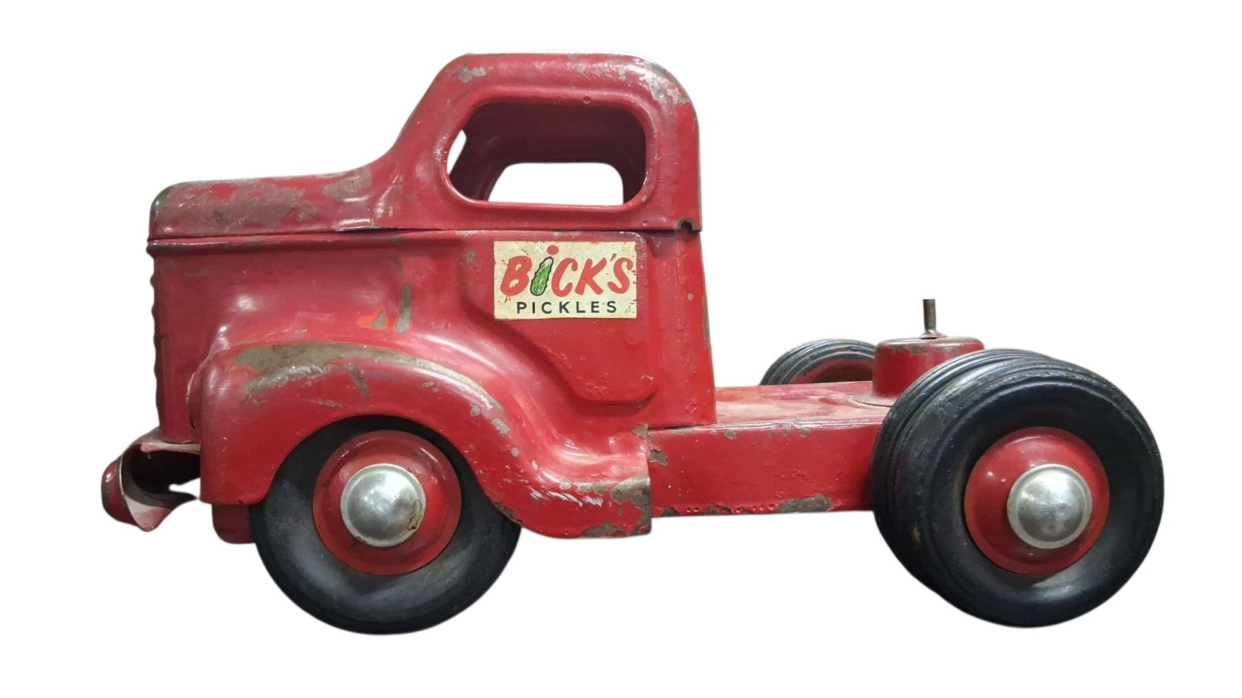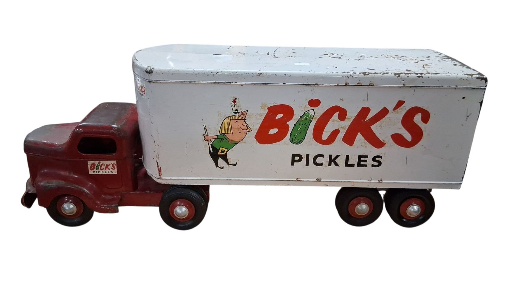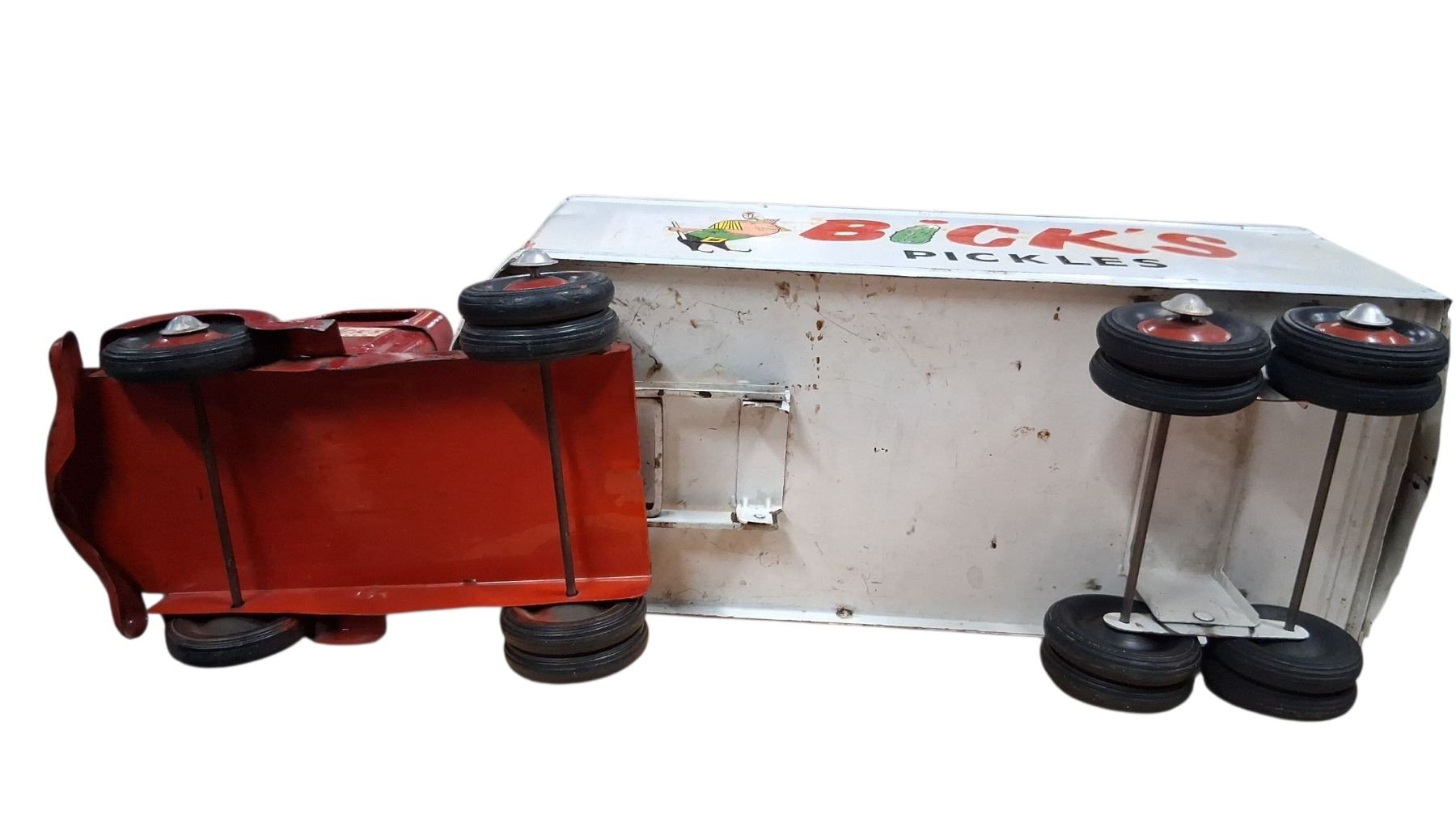 Vintage 50s Minnitoy pressed steel truck and trailer Bick's pickles 29" overall length