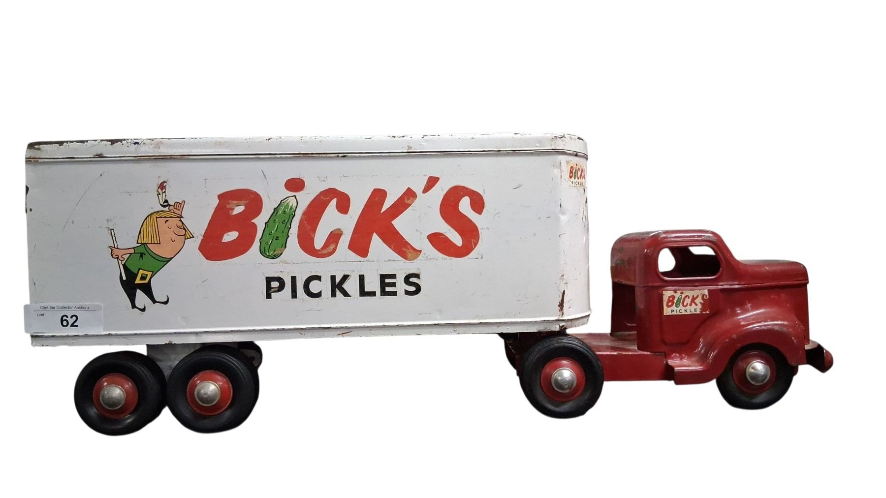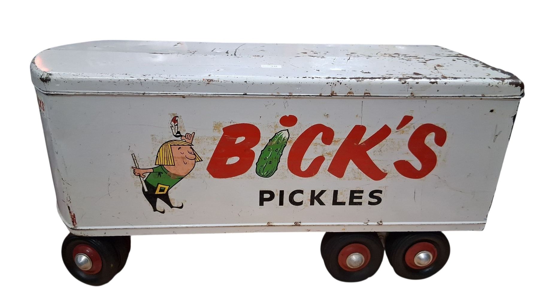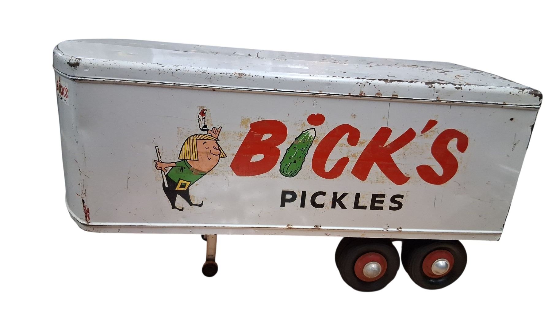 Vintage 50s Minnitoy pressed steel truck and trailer Bick's pickles 29" overall length