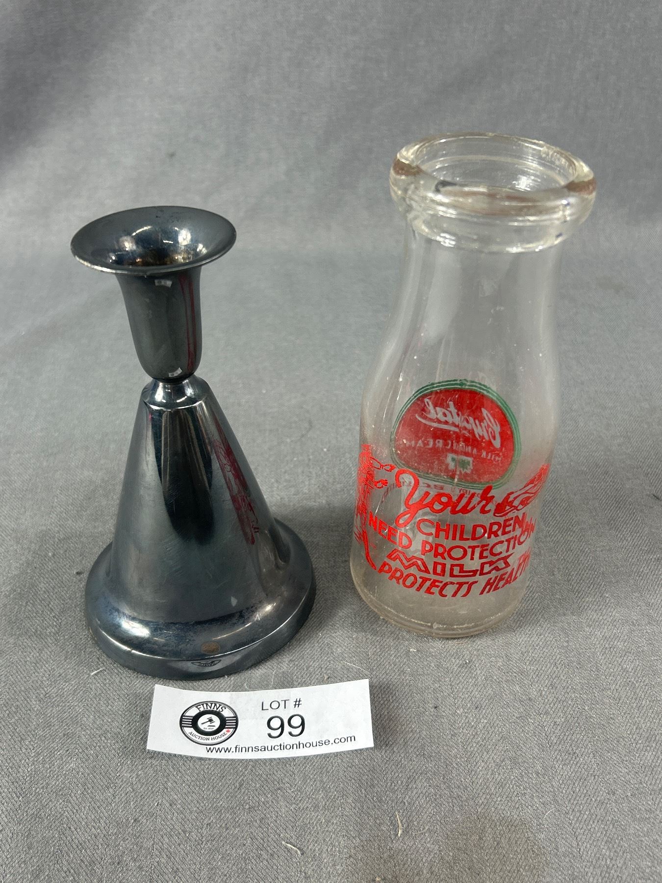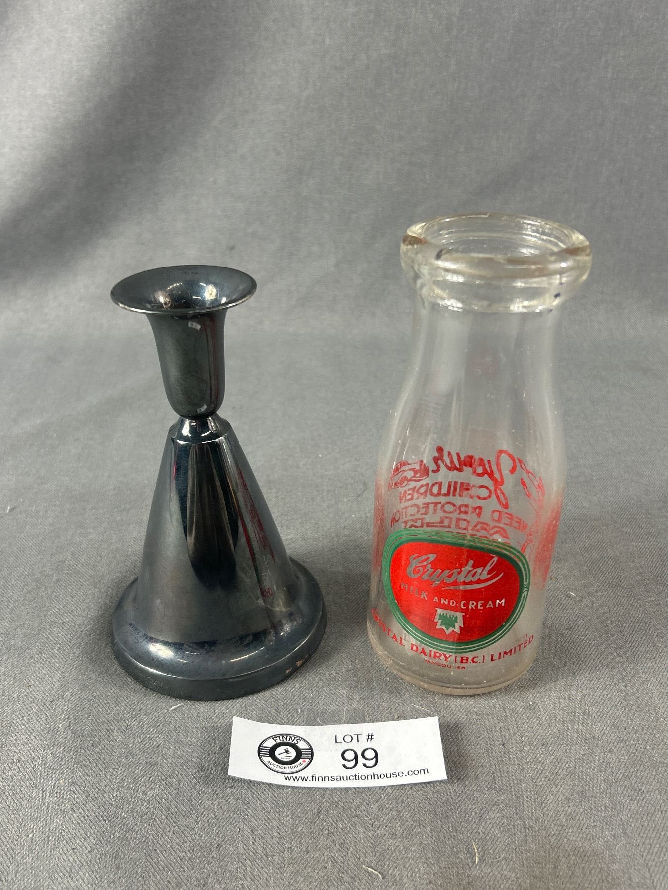 Vintage 6"H Crystal Dairy Vancouver Bottle & 5.5" H Marked 8305 431A Metal Candle Stick Holder