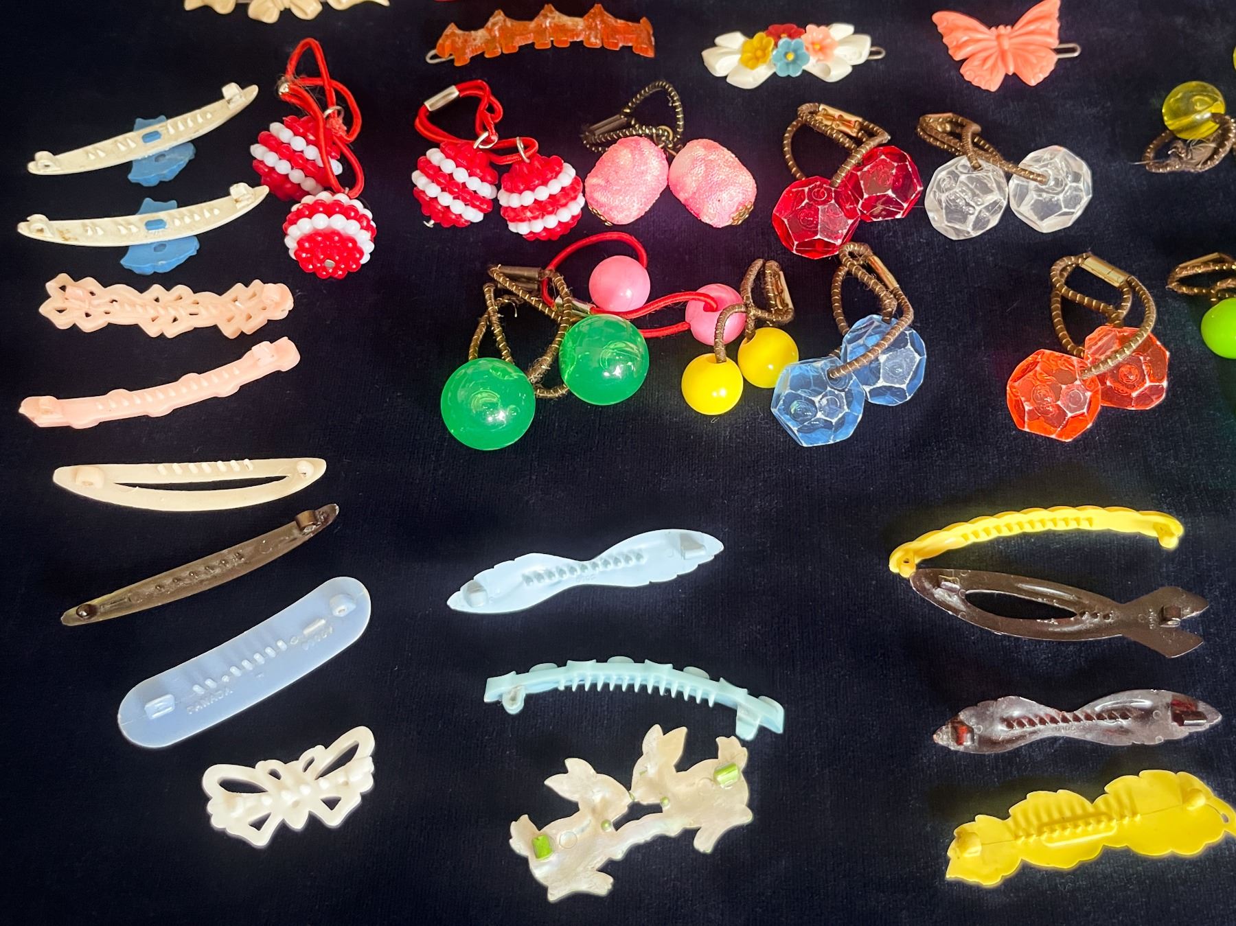 Mix of vintage plastic barrettes, clips, novelty elastics, and more. Some plastic barettes have missing backs (can be switched out with simmilar sized) which ones can be seen in photos