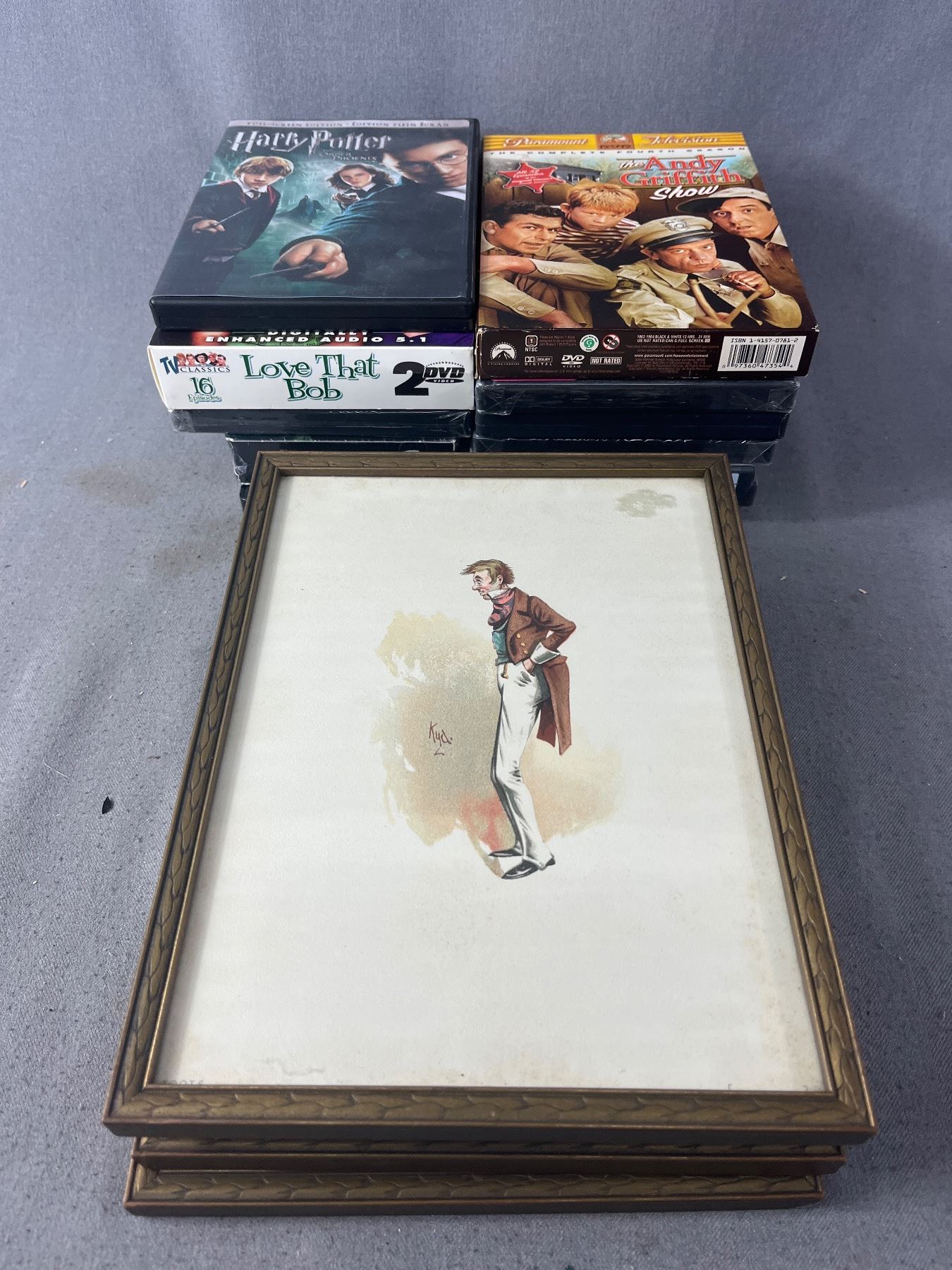 Vintage 8" x 10" Framed Dickens Character Prints Plus An Assortment Of DVD & VHS Movies Including Harry Potter