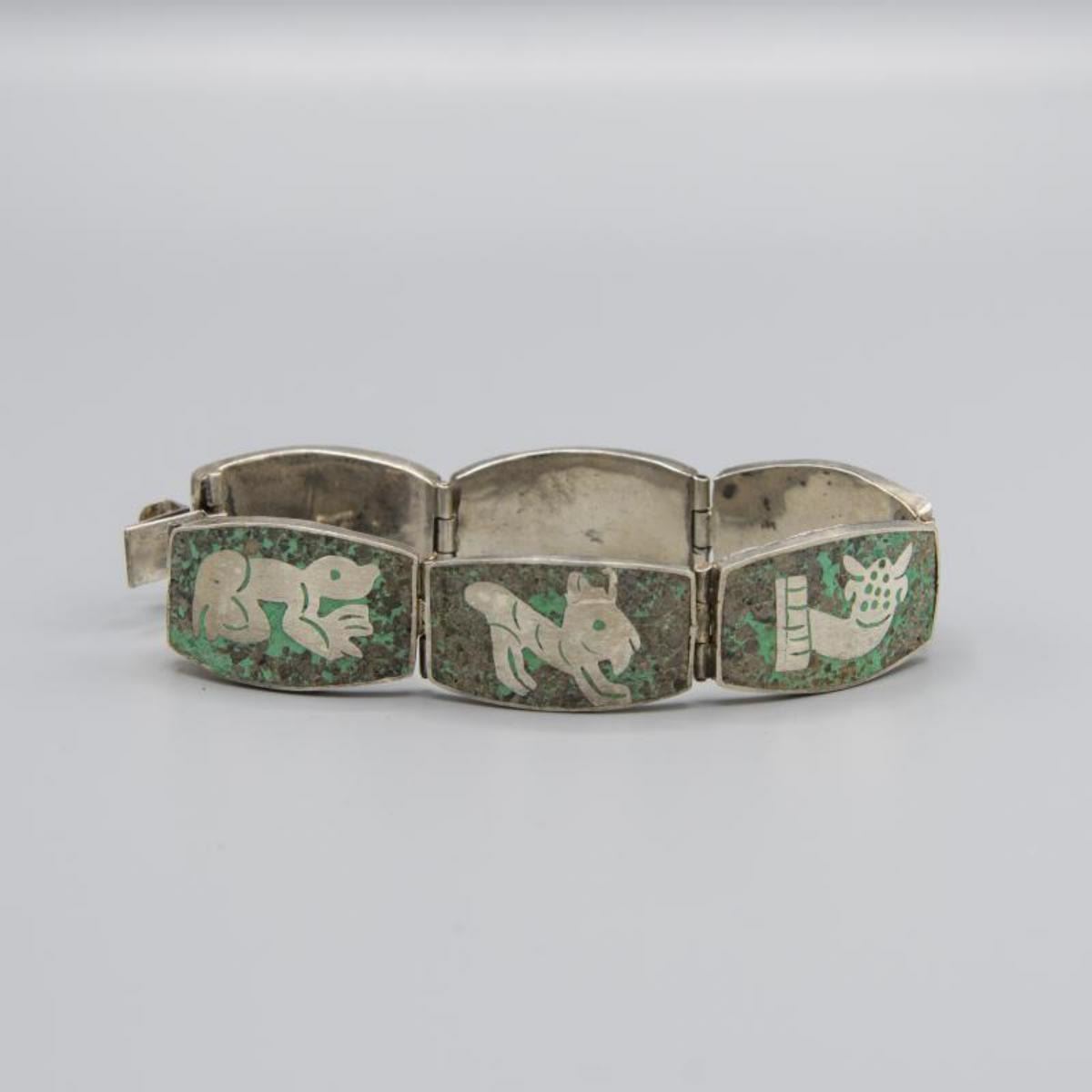 Vintage Solid.925 Sterling Silver Natural Inlayed Turquoise Bracelet.Hand crafted in Mexico with detail Aztec Silver Symbols.231.5 Cttw or 46.3 total gram weight. Approx 7 to 8 " long. Very rare and unique.