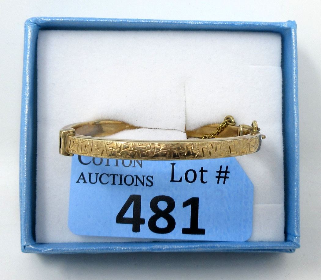 Hinged bangle with safety clasp and chain. (Chain needs to be reattached). Made in England for Birks. 6.1 Grams.