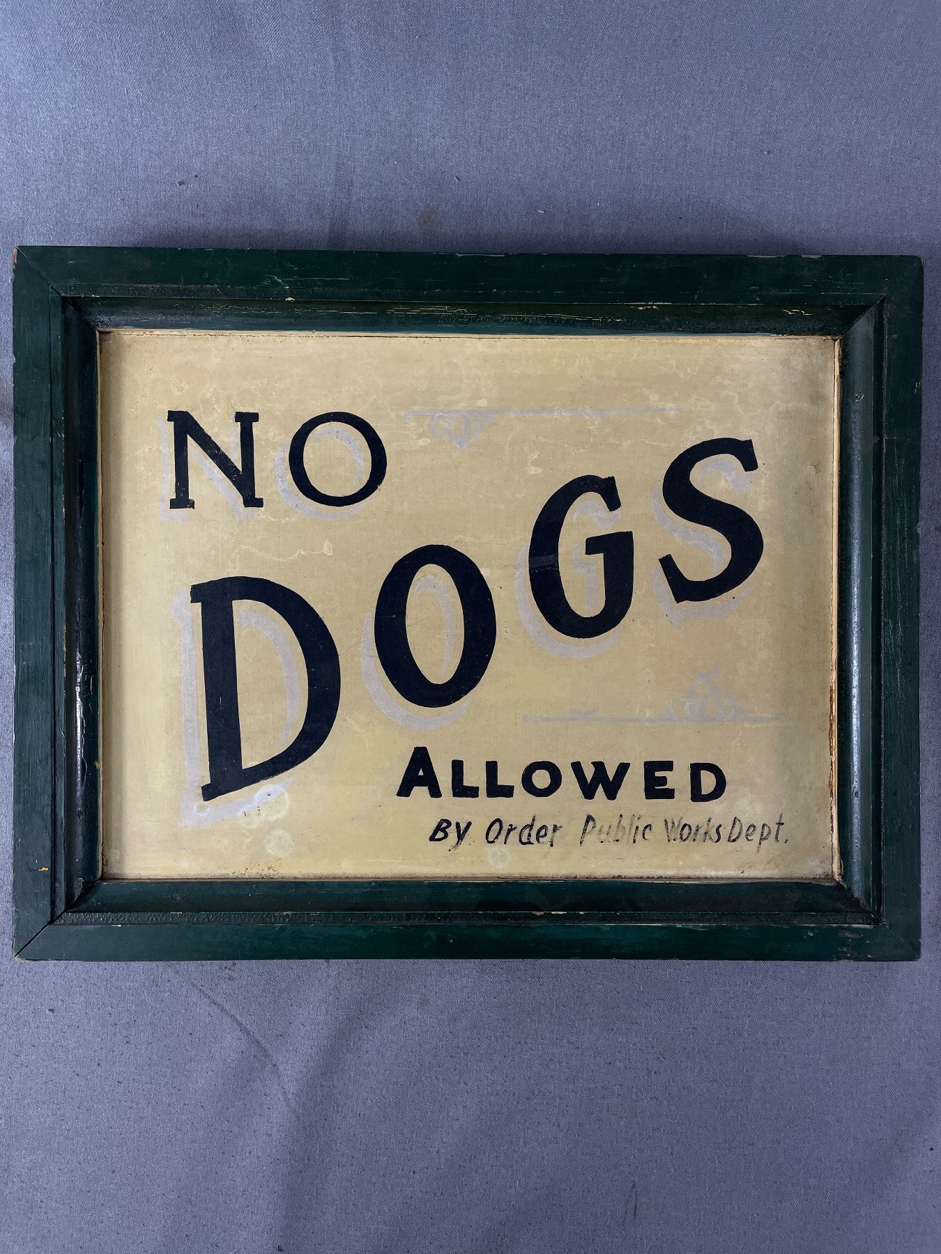 Vintage All Wood Framed "No Dogs Allowed" Public Works Dept. Sign. Approx. 18.75" x 14.75" x 1.5"