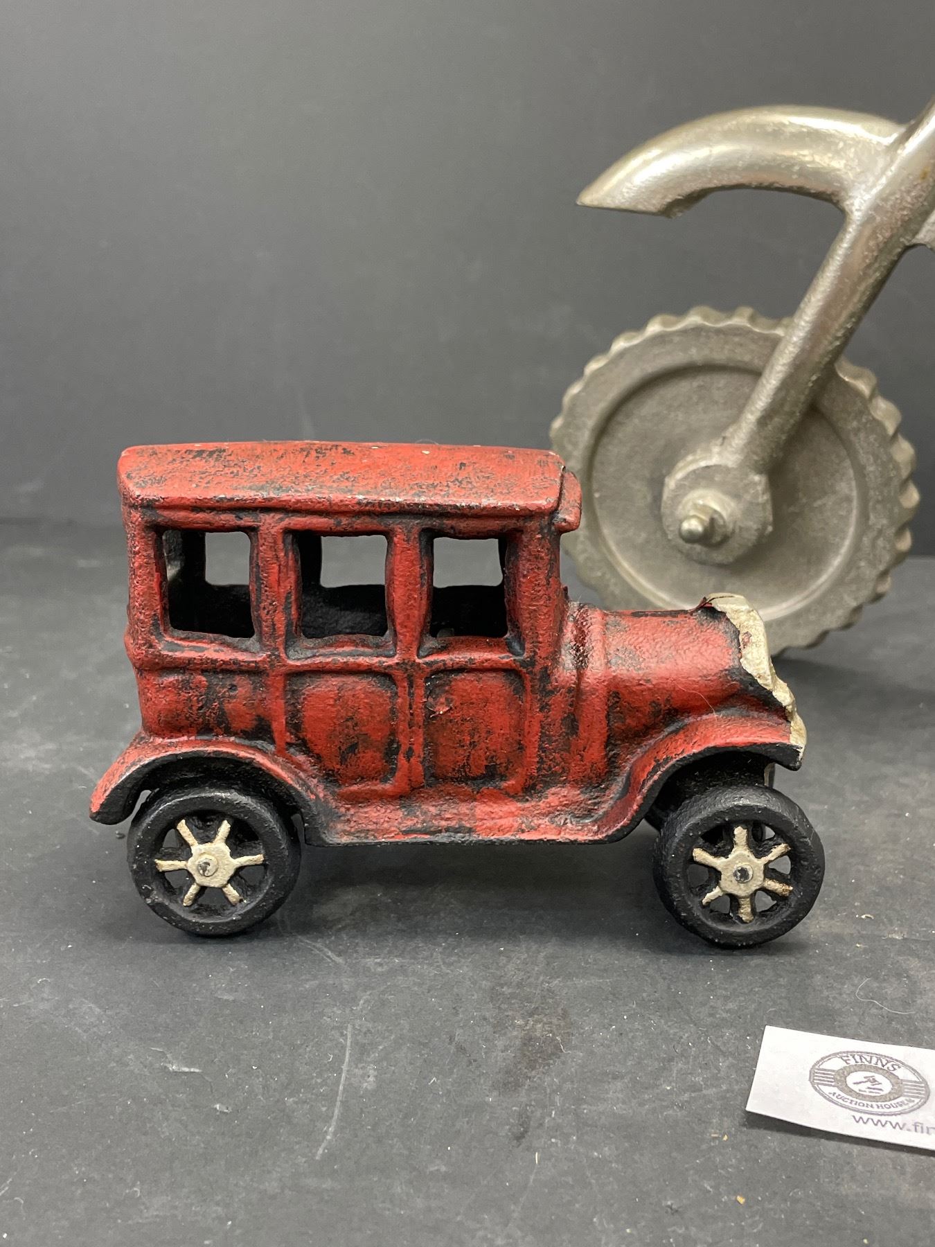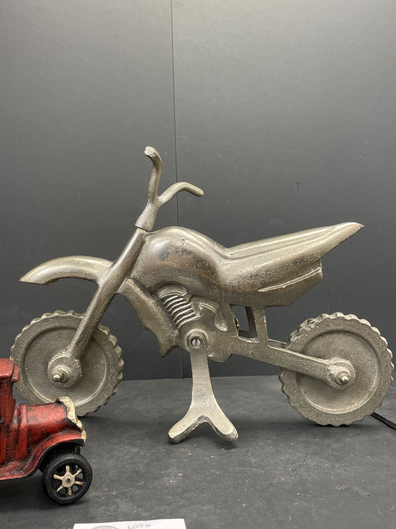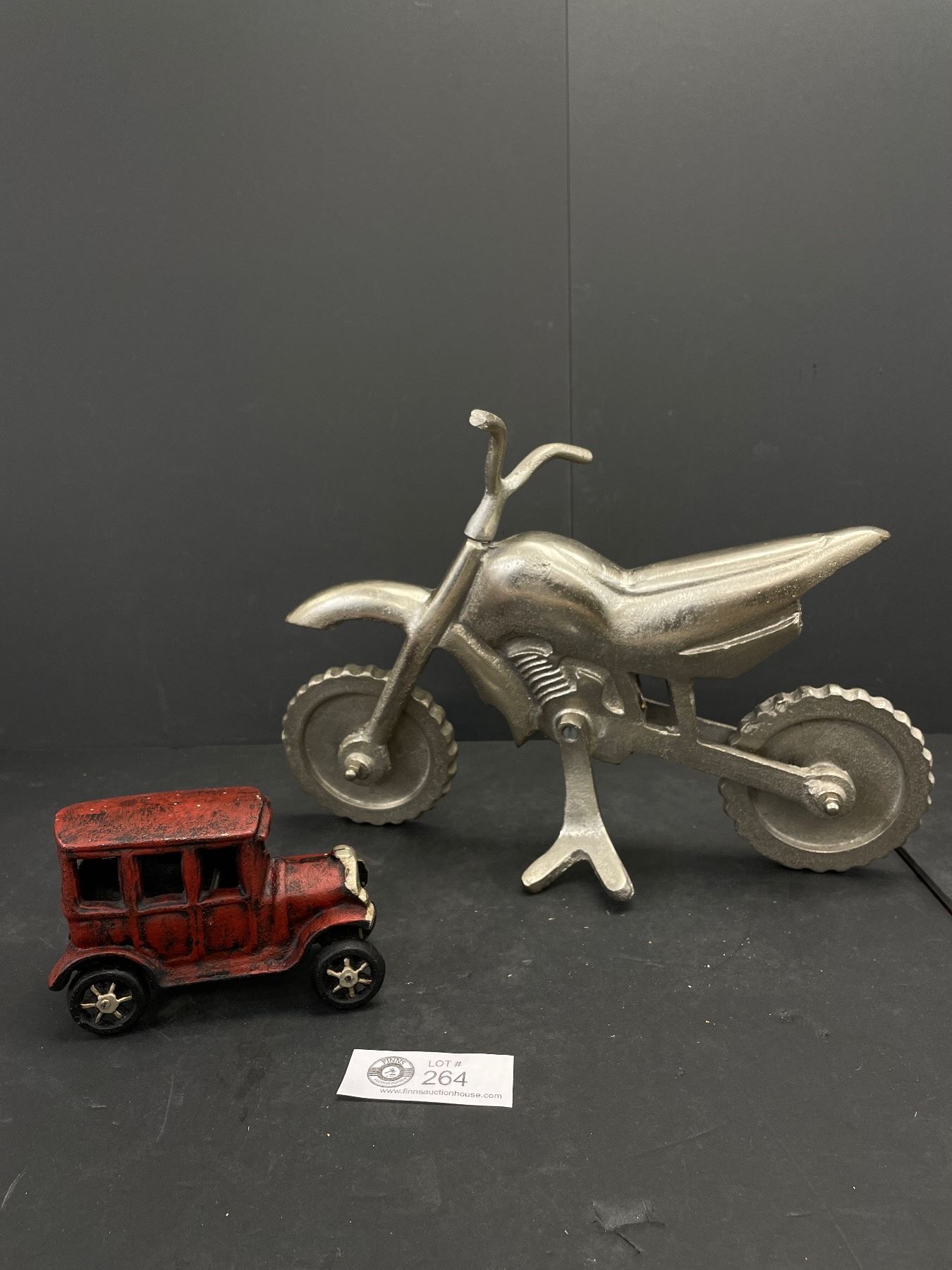 Vintage Aluminum Motorcycle Art Sculpture and Vintage Cast Metal Model T Ford Sedan Car