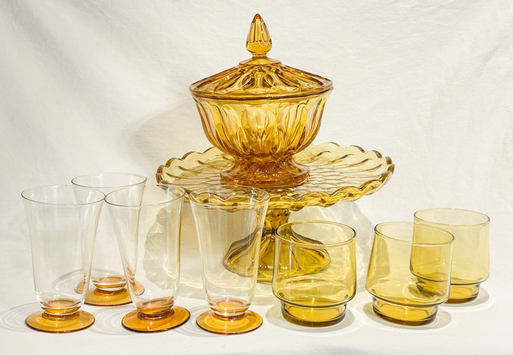 Mid-century amber glass collection featuring a pedestal cake stand, matching covered candy dish, a set of 4 flared glasses, and 3 lowball glasses. Beautiful warm amber tone adds vintage charm to any table or display. One glass in the set of 4 has a small rim chip; all other pieces are in very good condition.