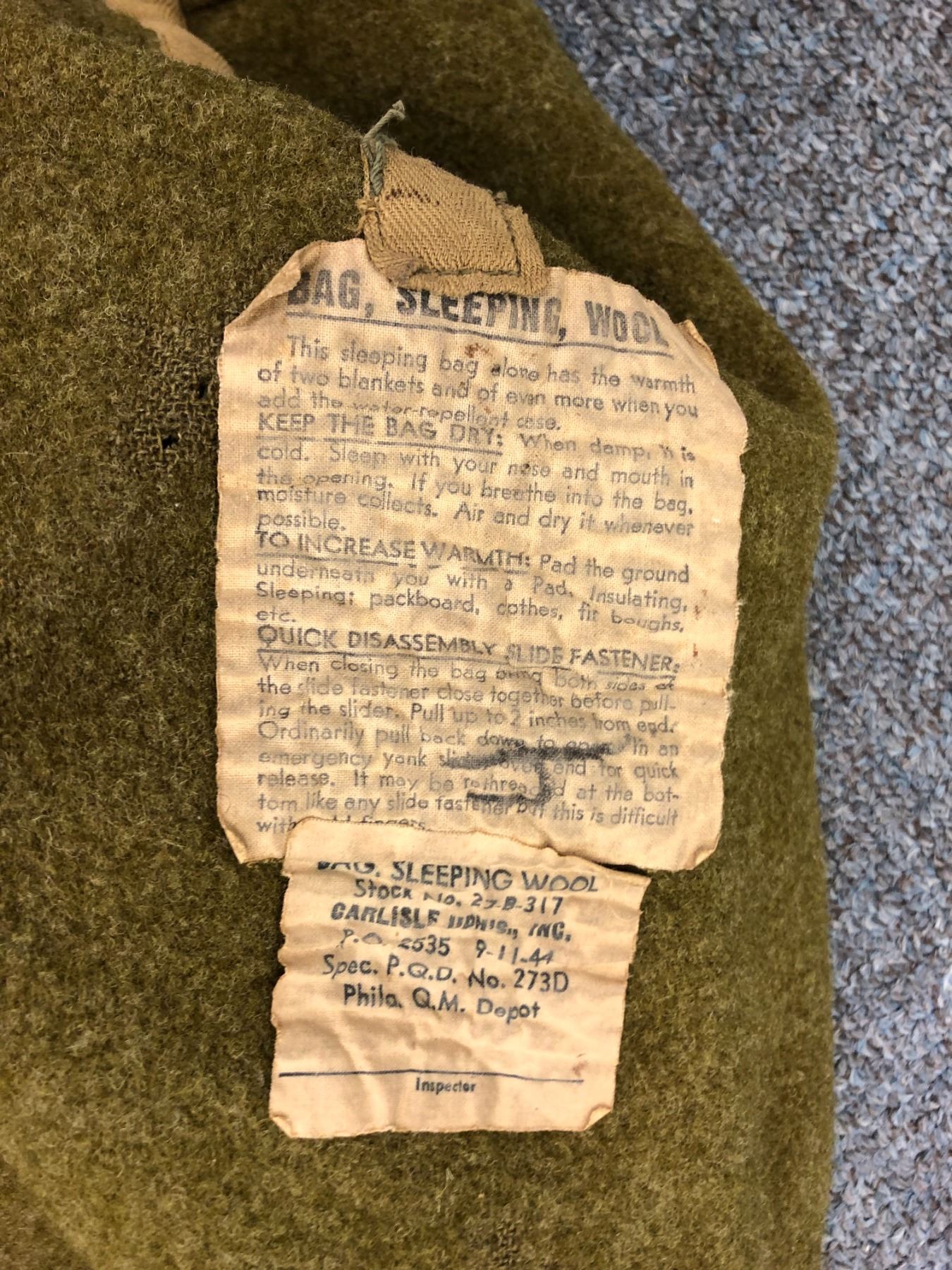 Vintage American World War II War Wool Inner Sleeping Bag/ Duffle Bag & Straps