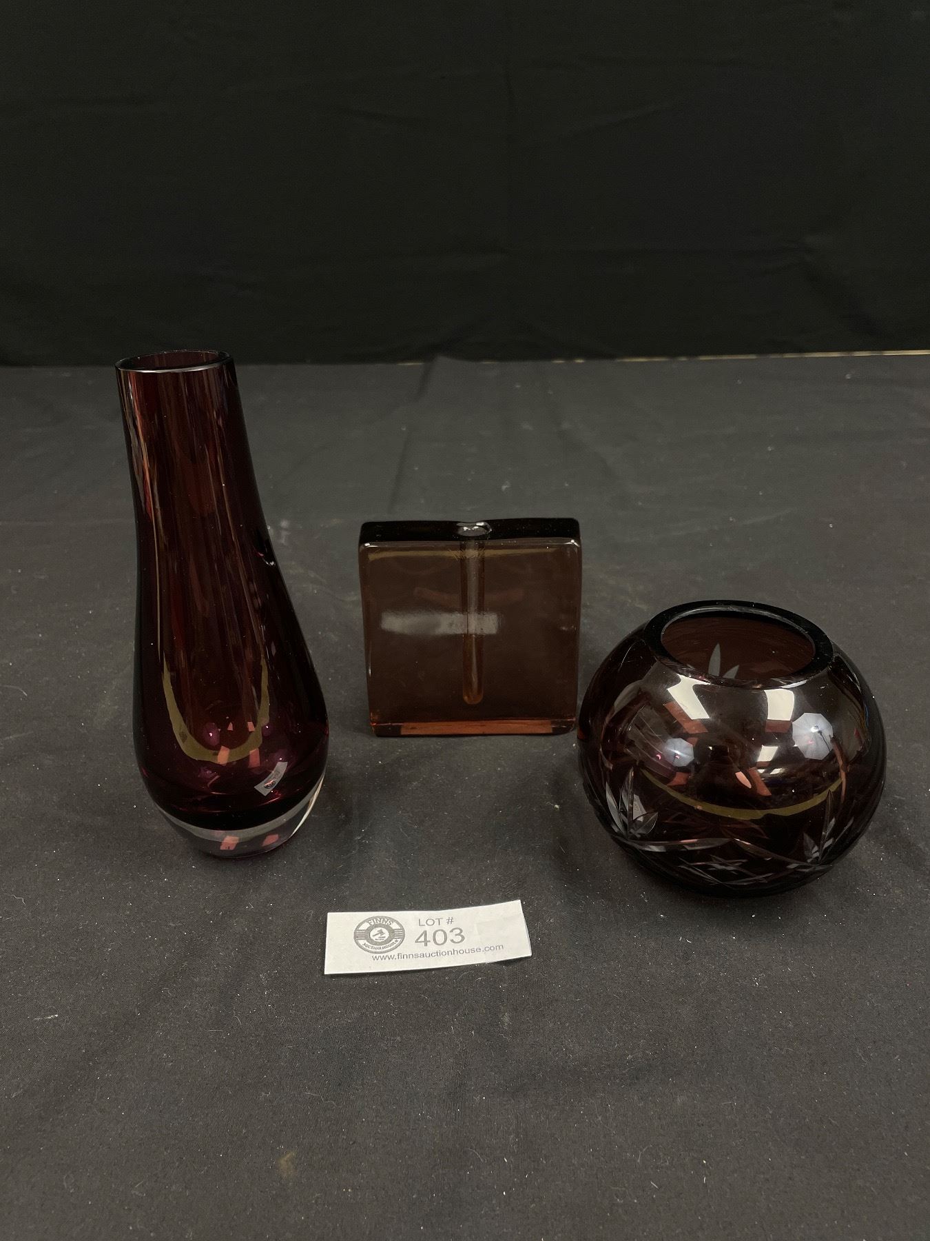 Vintage Amethyst Art Glass Lot - Murano Style Bud Vase, Cut to Clear, Rose Bowl Vase and Lisbeth Dahl Made in Denmark