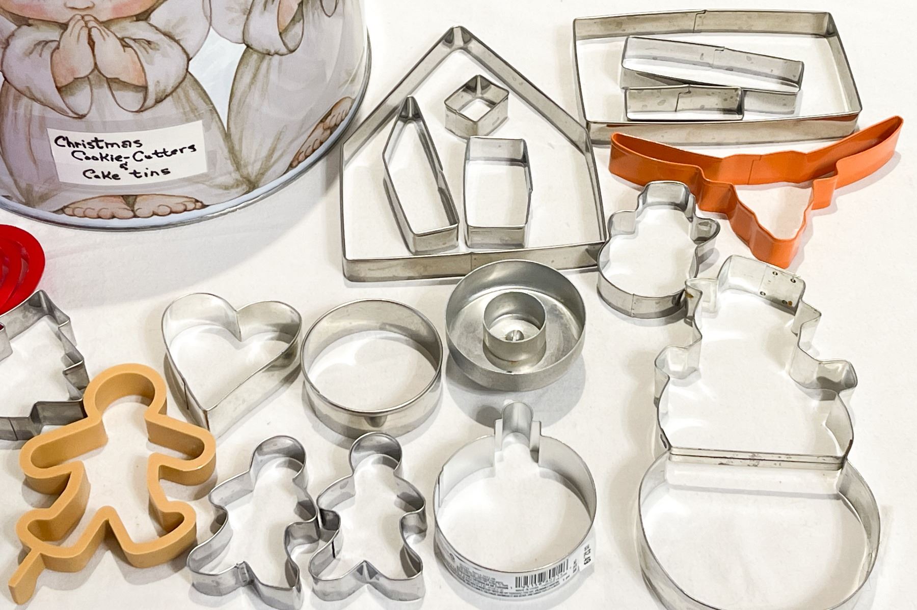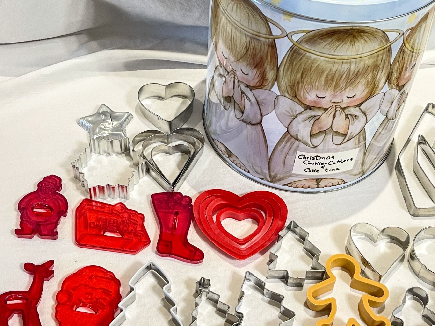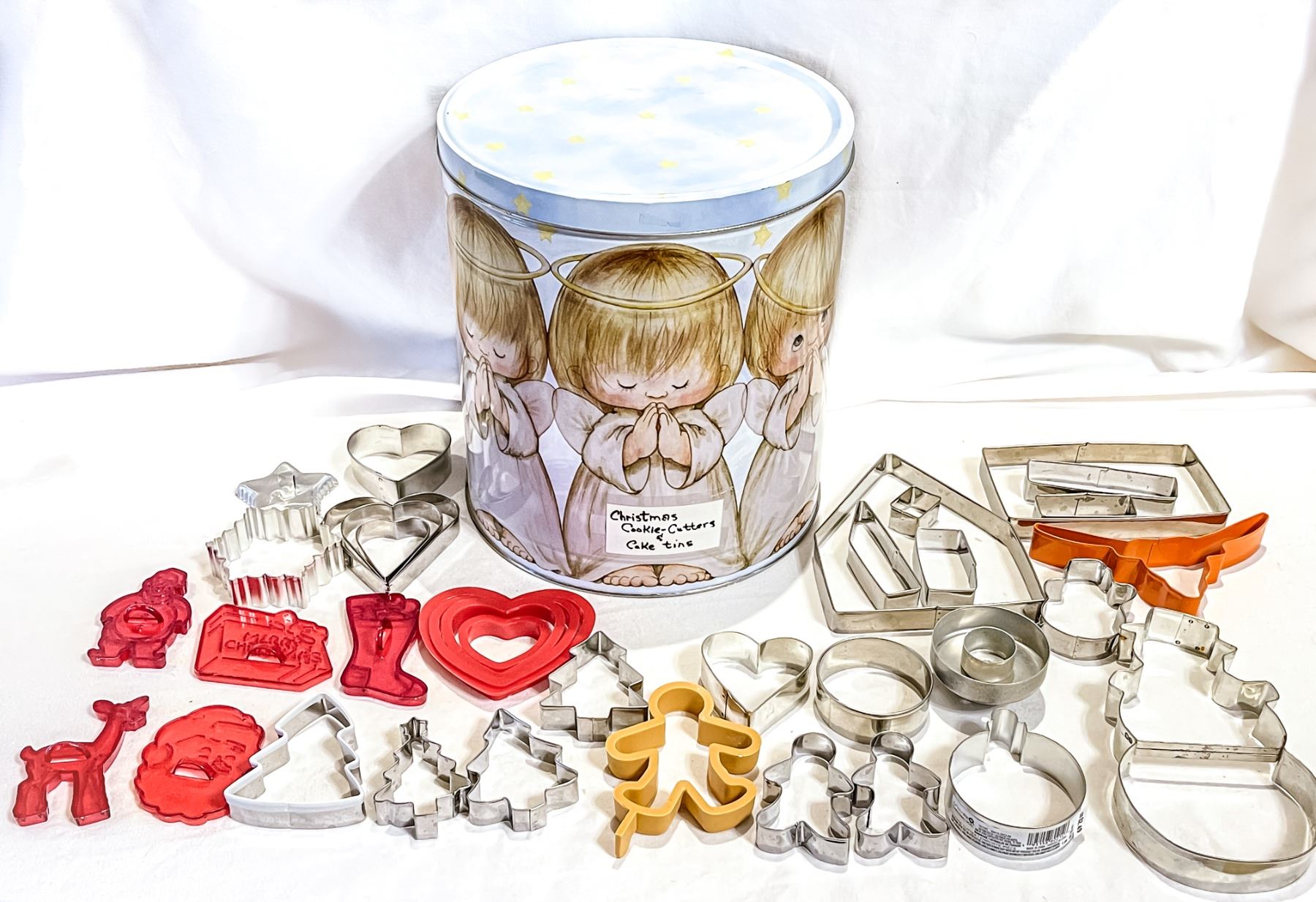 Charming vintage angel tin filled with a large assortment of cookie cutters, including a full gingerbread house set, Texas longhorn, stars, hearts and many Christmas-themed shapes