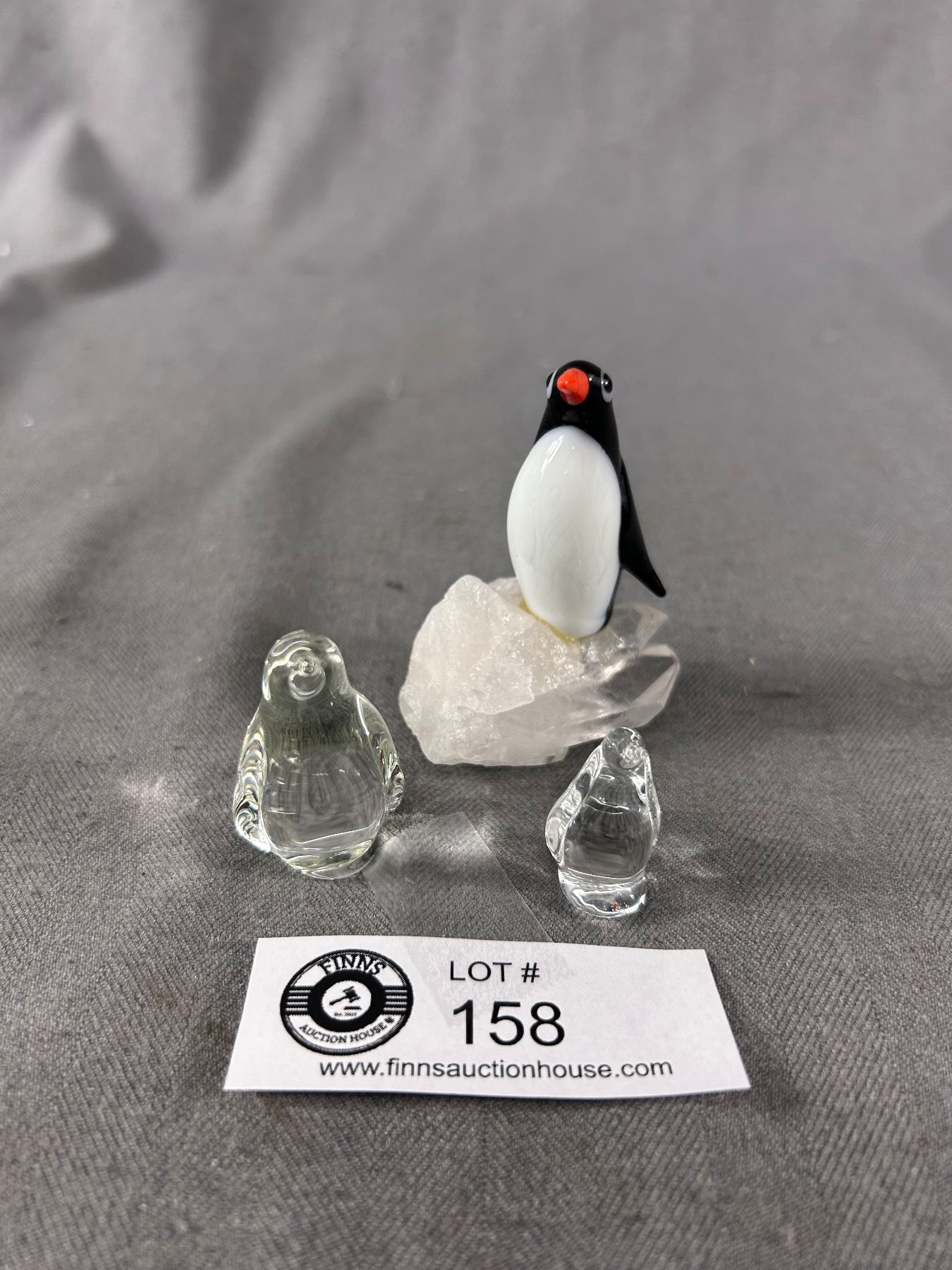 Vintage Art Glass Penguin on Crystal Quartz Base and Pair of Glass Penguin Figurines