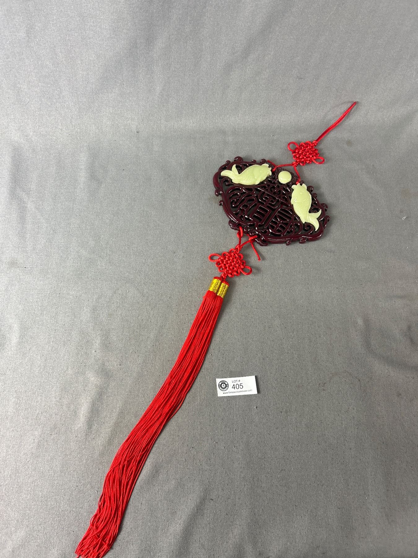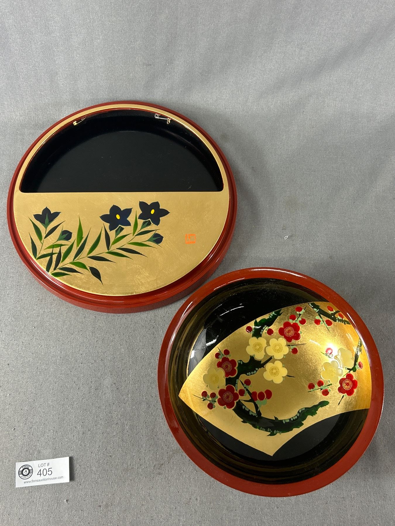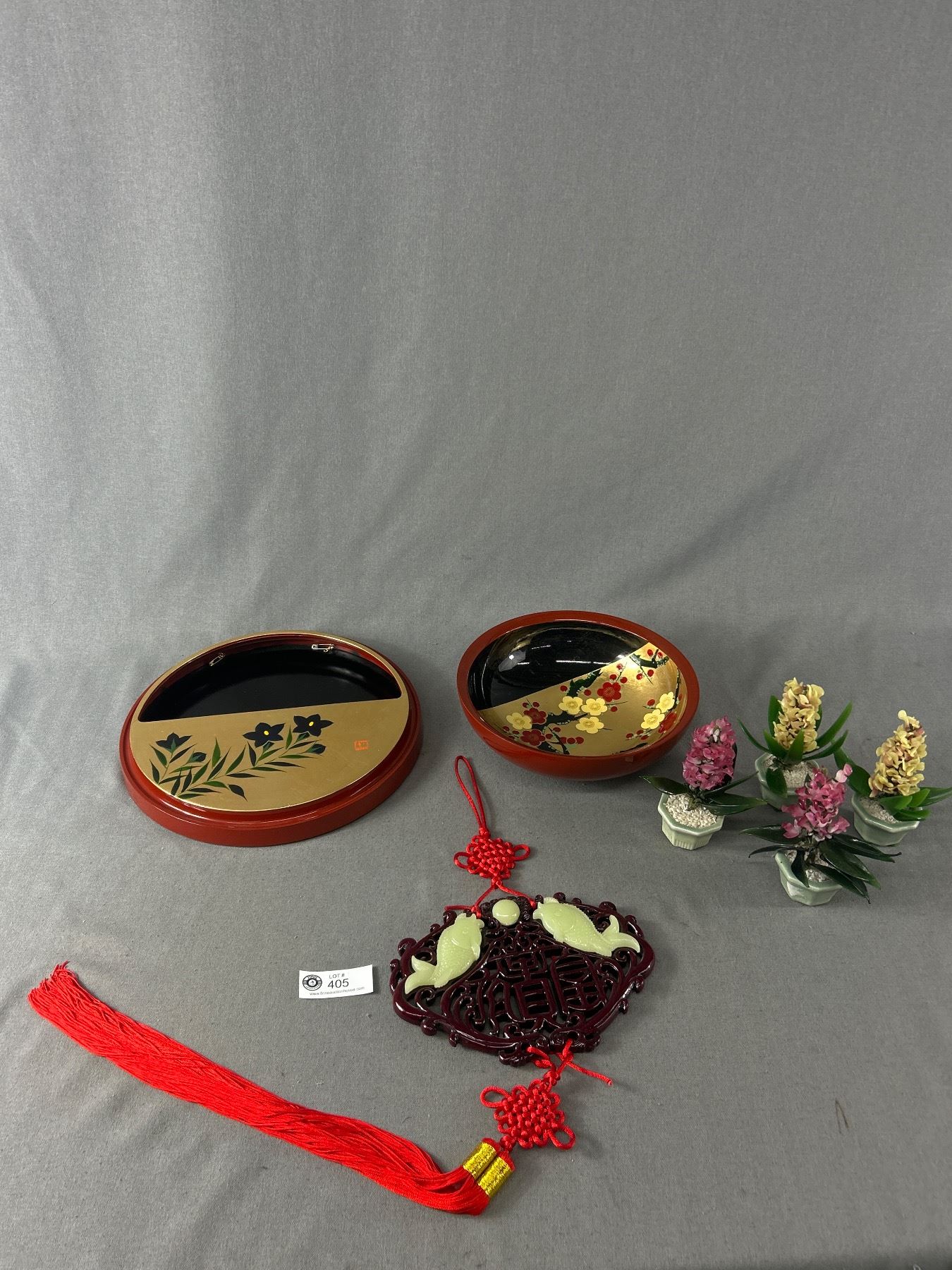 Vintage Asian Décor Lot - Lacquerware Bowl and Wall Pocket, Wall Hanging, Glass Trees