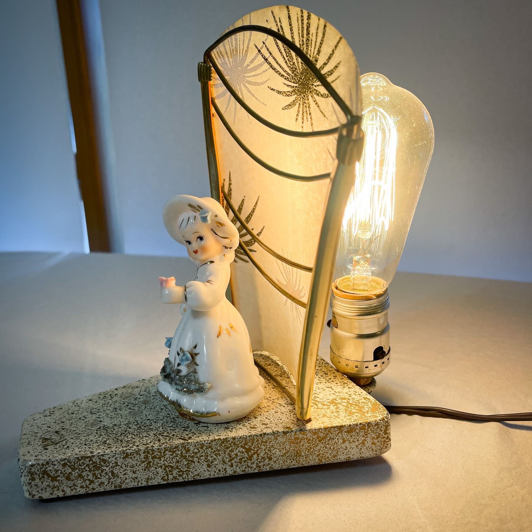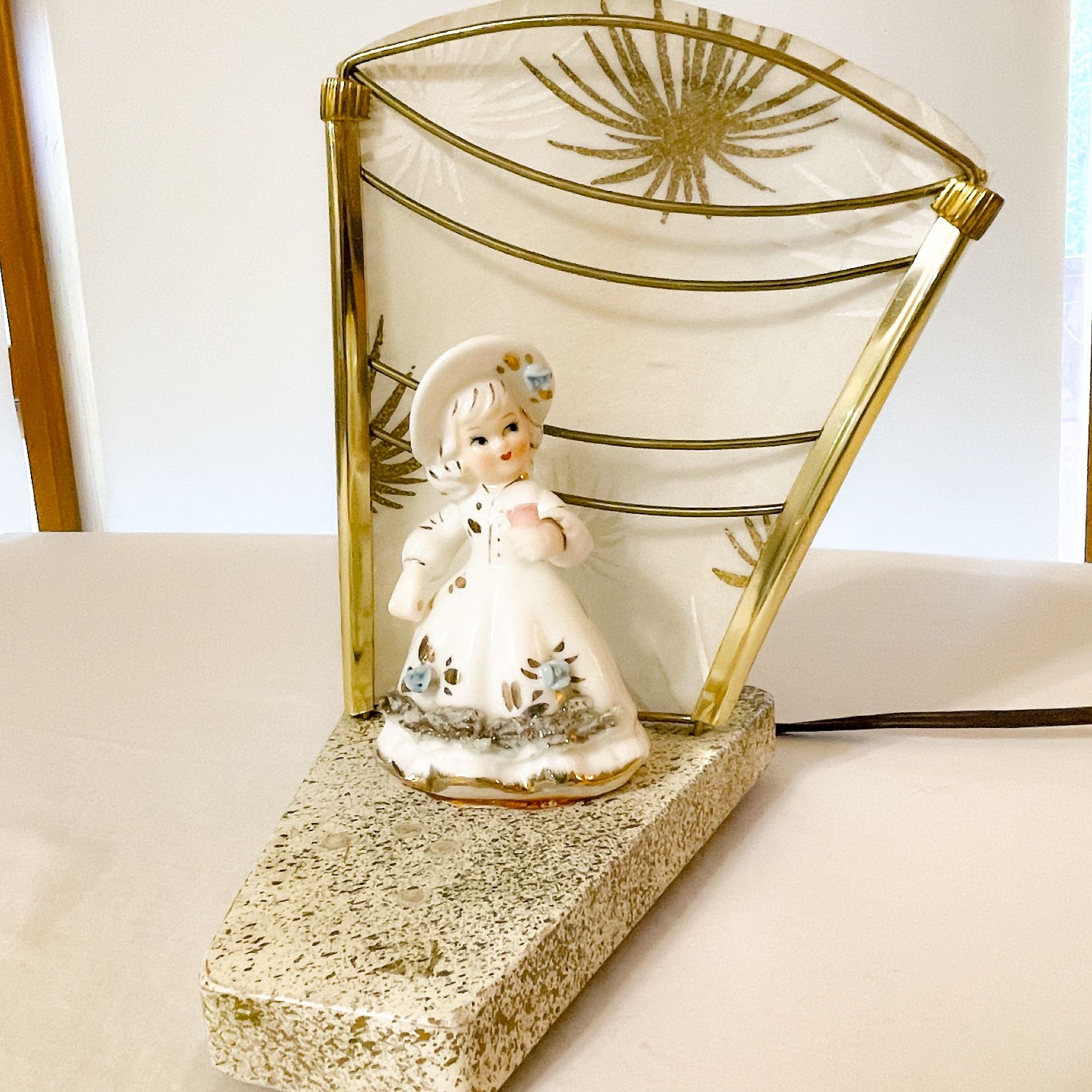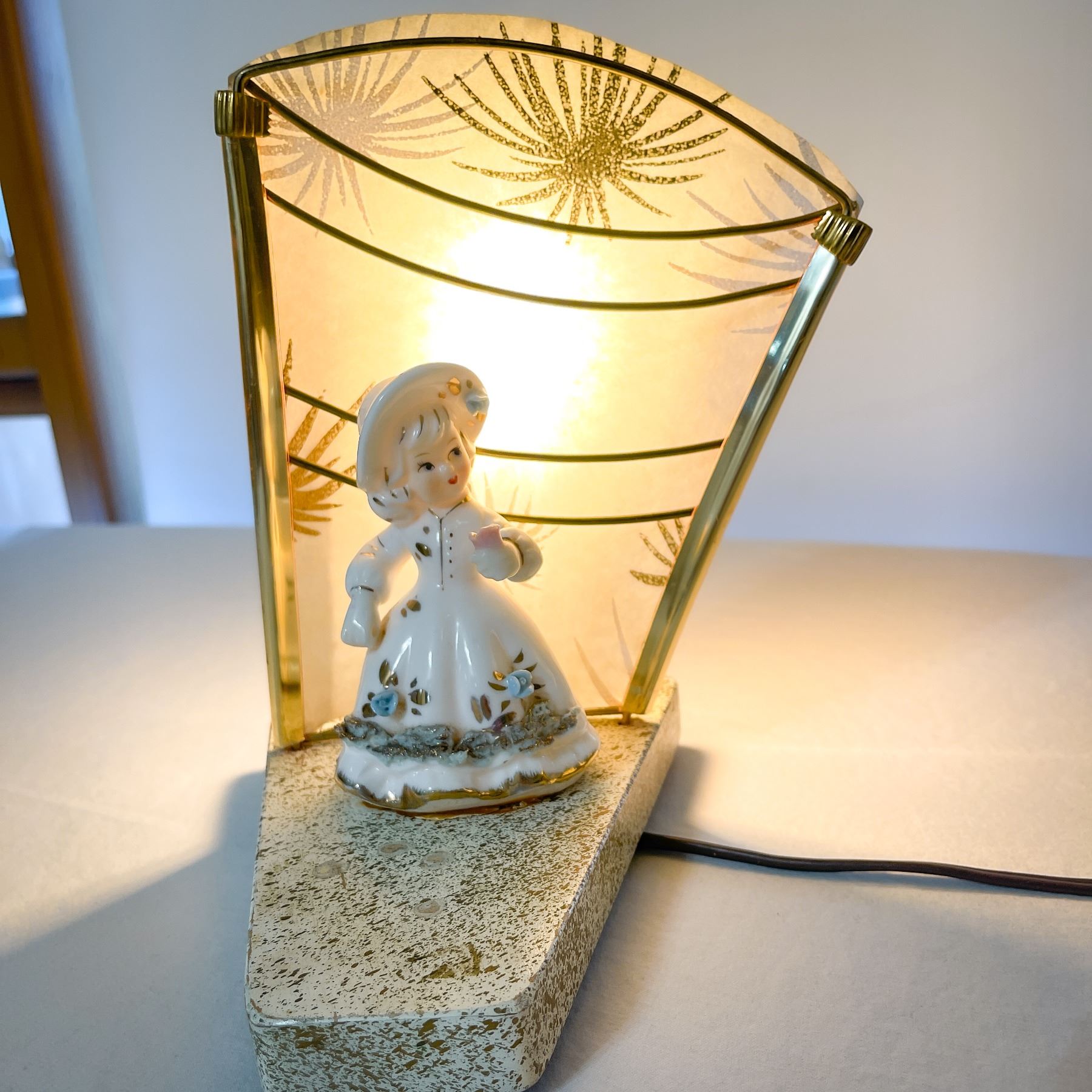 Charming mid-century lamp featuring a porcelain girl figurine, textured stone base, and vellum shade with gold detailing. Works perfectly and adds a nostalgic retro touch. Good vintage condition with light wear consistent with age.