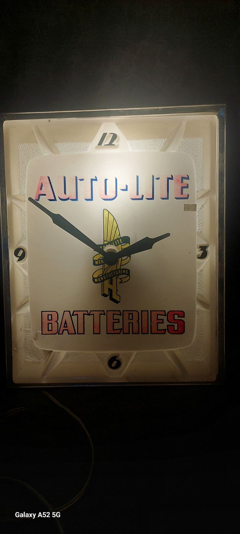 Vintage Autolite Batteries light up clock, tested, some damage 21" x 18"