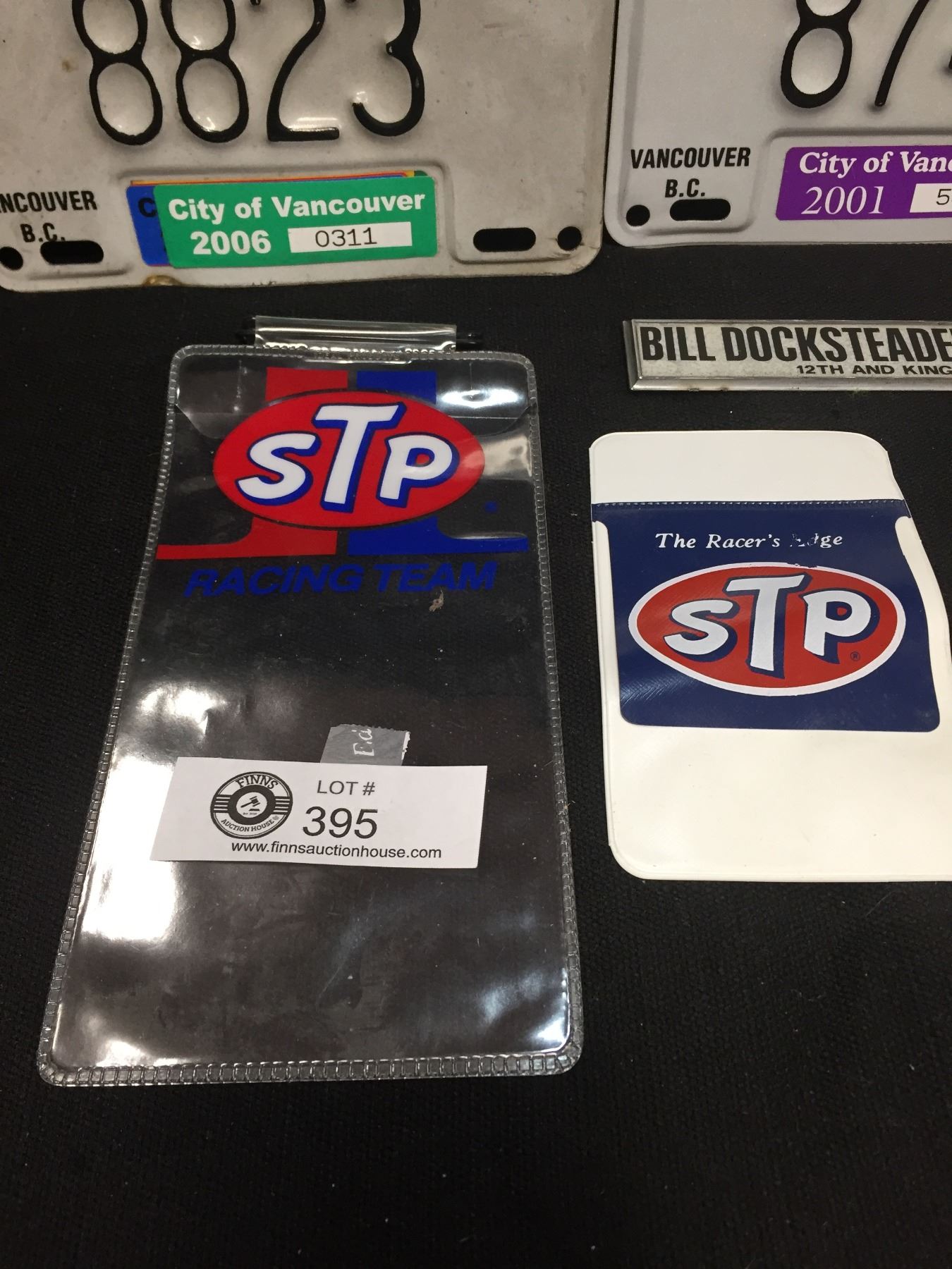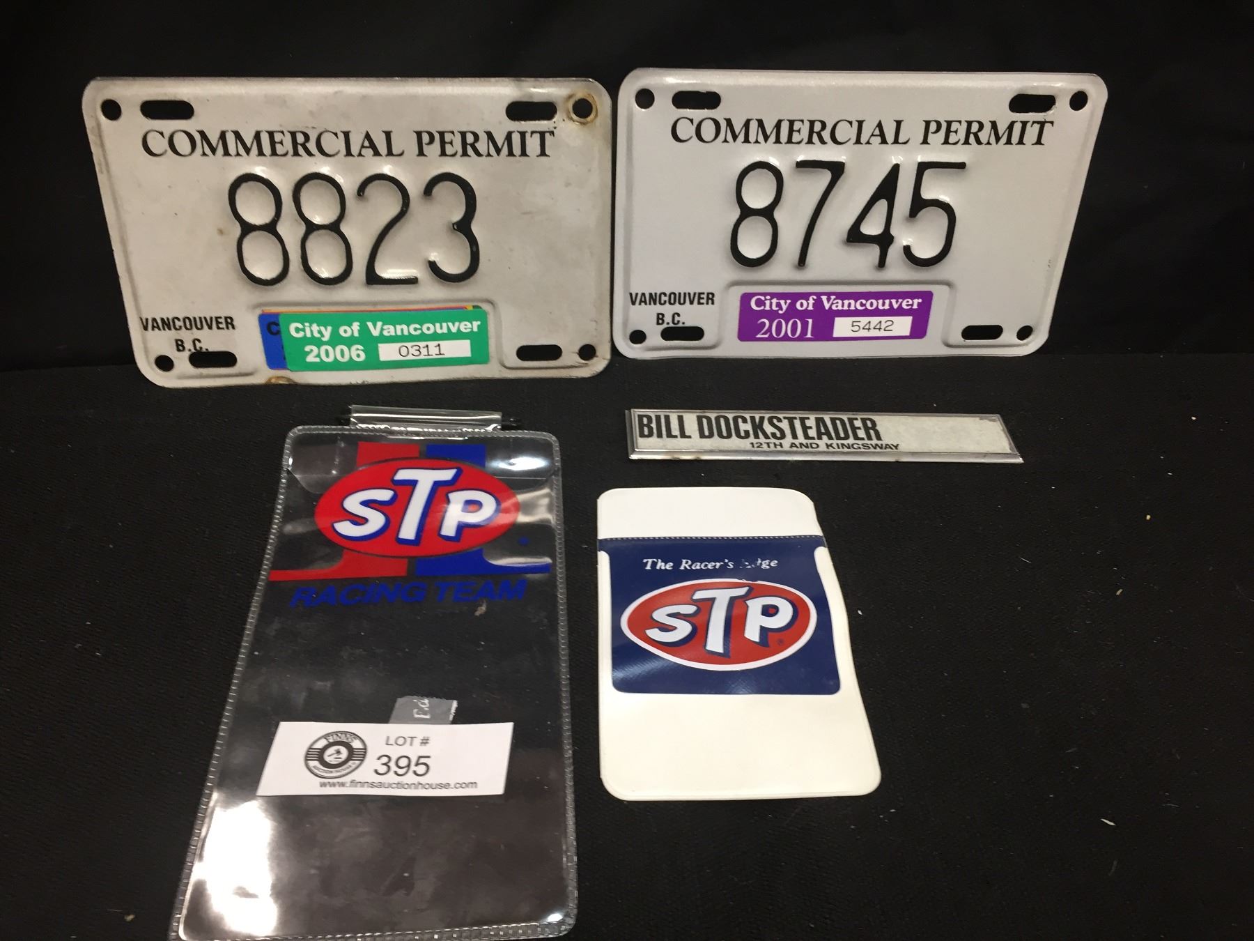 Vintage Automotive Lot. Vancouver Commercial Plates, Bill Dockstedar 12 and Kingsway Car Plate, STP Racing Team Holders