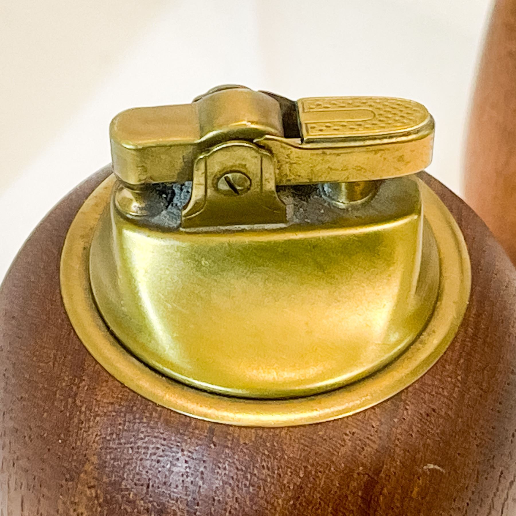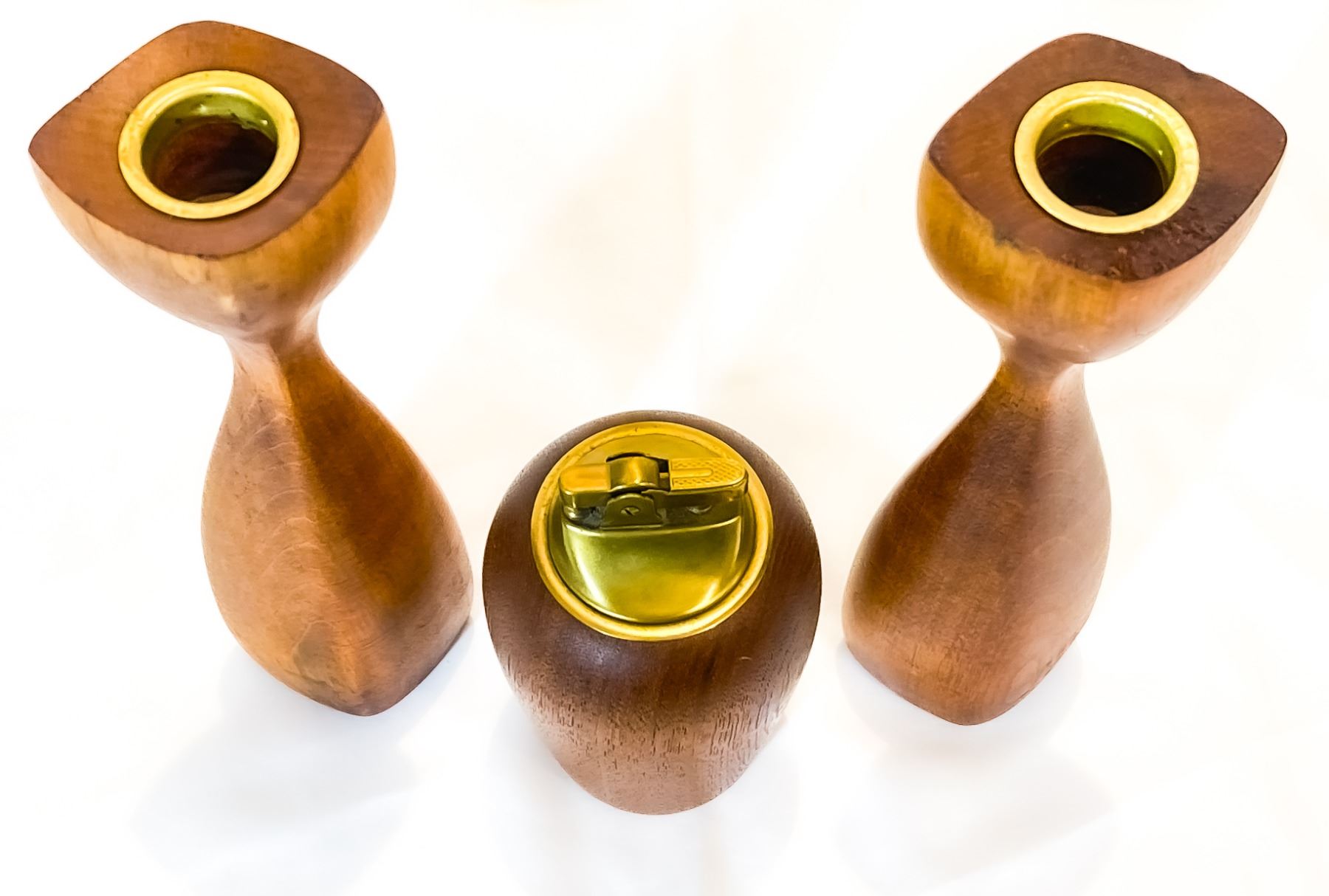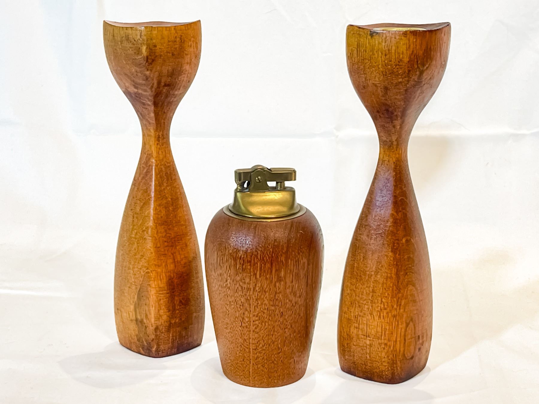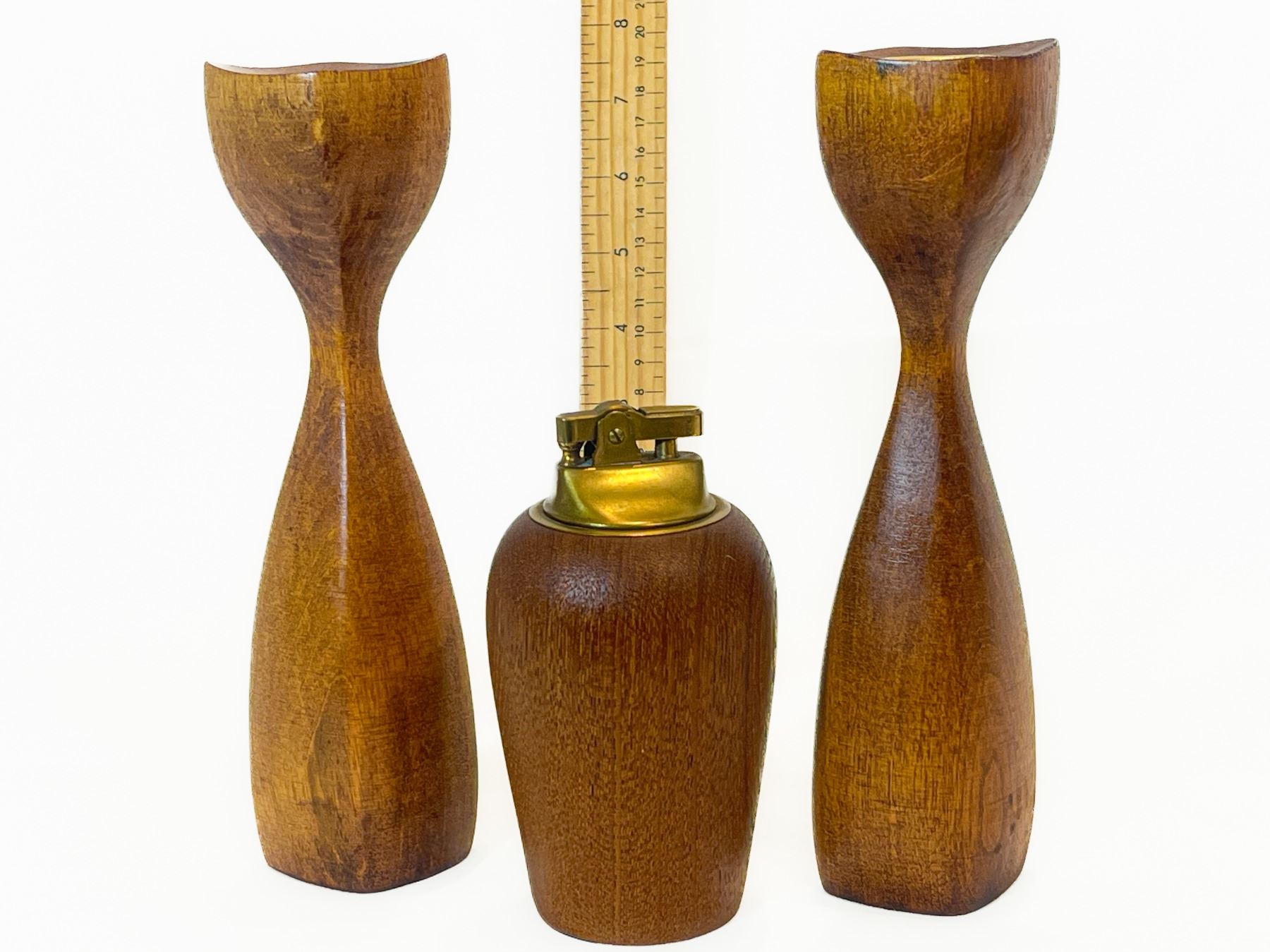 Beautiful mid-century modern teak set featuring a genuine B-J Norway teak and brass table lighter paired with two Danish tulip-style candleholders. The lighter bears the original B-J crown mark and brass top, while the candleholders display the elegant flared “tulip” shape and smooth sculpted curves that define Danish modern design.