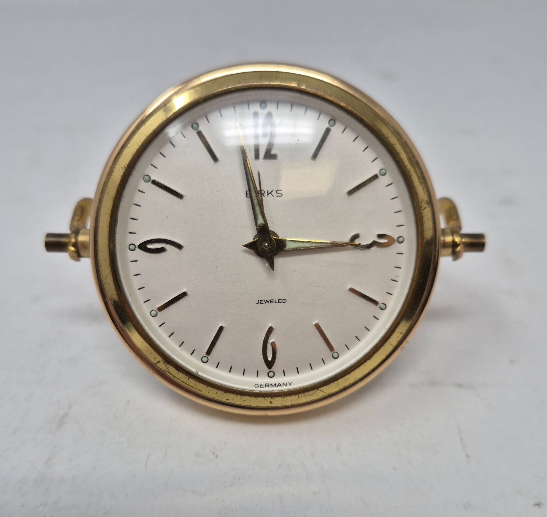 Elegant BERKS jeweled travel clock. Made in Germany. Gold-tone casing with stand. Smooth wind-up movement. Stylish and collectible.