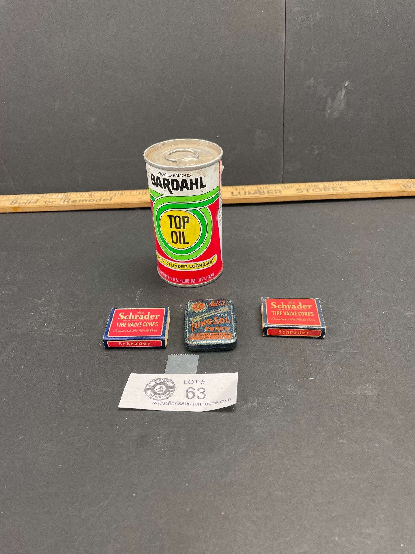 Vintage Bardahls Upper Cylinder Oil 6 US Fluid Ounces - Full Plus 2 Boxes Schrader Tire Valve Cores and 1 tin box of Tung Sol Fuses
