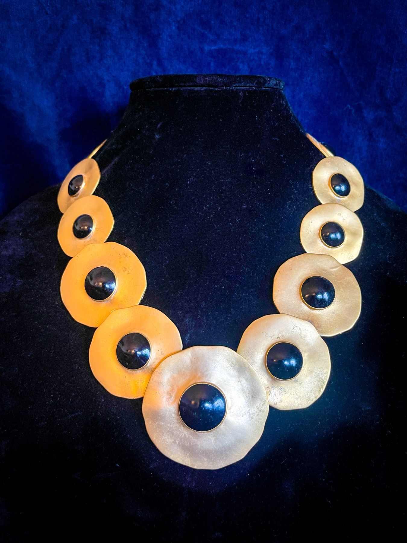 Striking brutalist-style necklace featuring large matte gold-tone discs with glossy black centers. Graduated design with sculptural, irregular forms and dramatic scale. Unsigned.