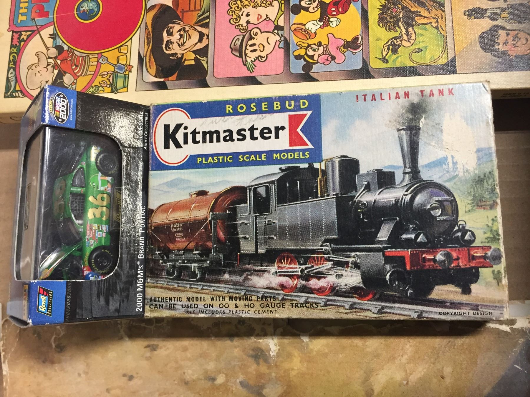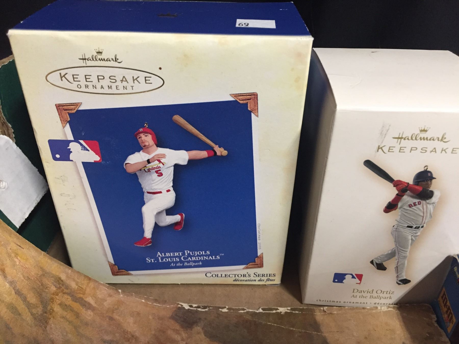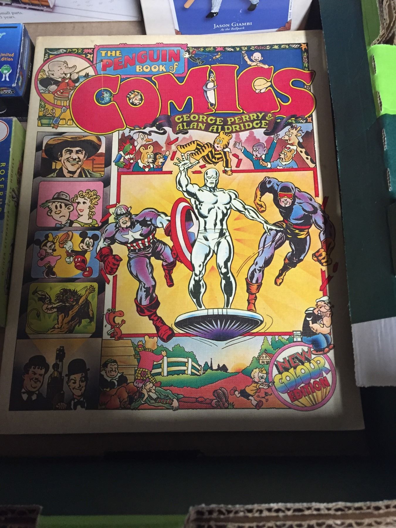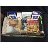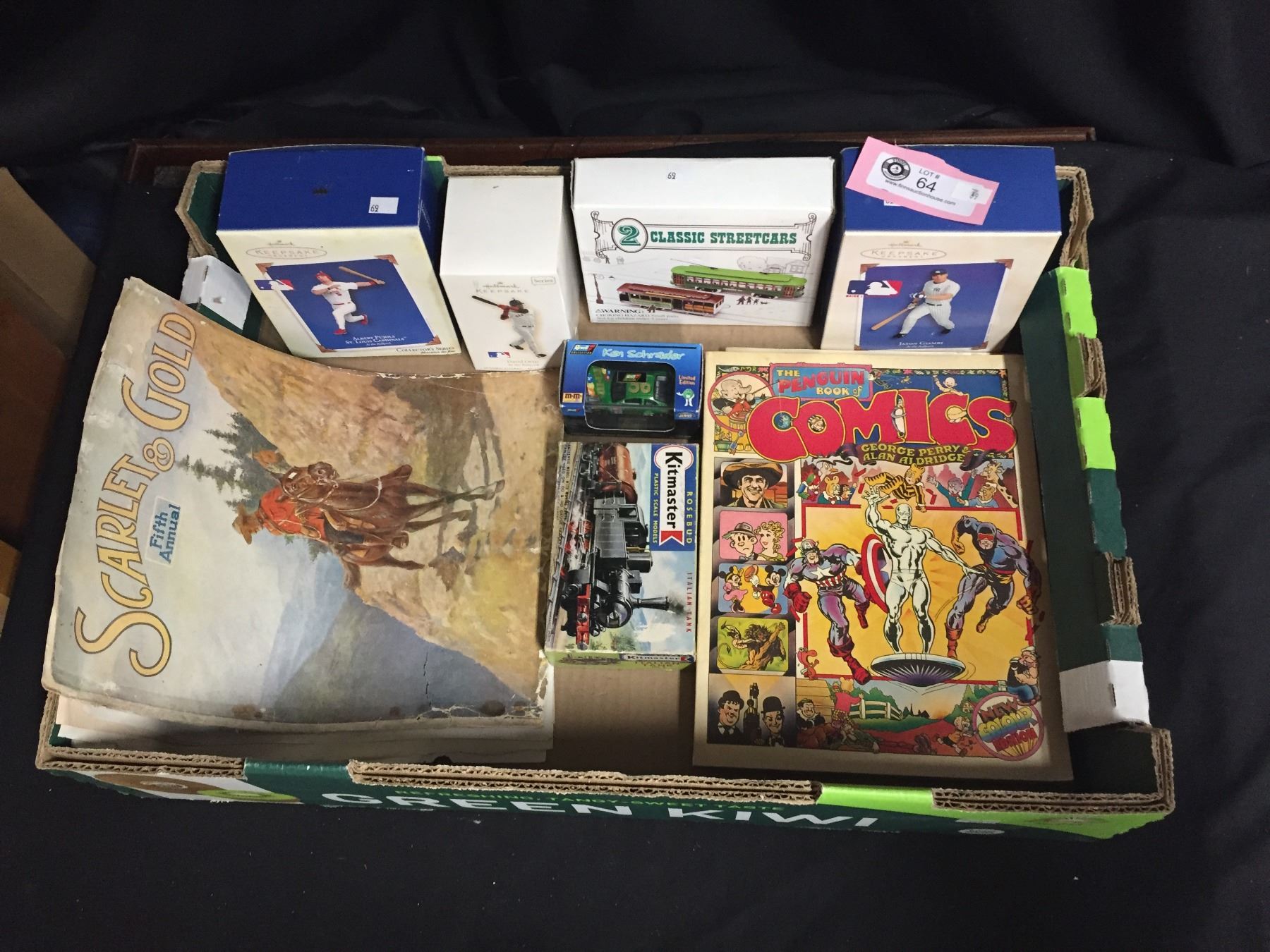 Vintage Box Lot Penquin Book of Comics,Baseball Ornaments, Trains in Boxes etc