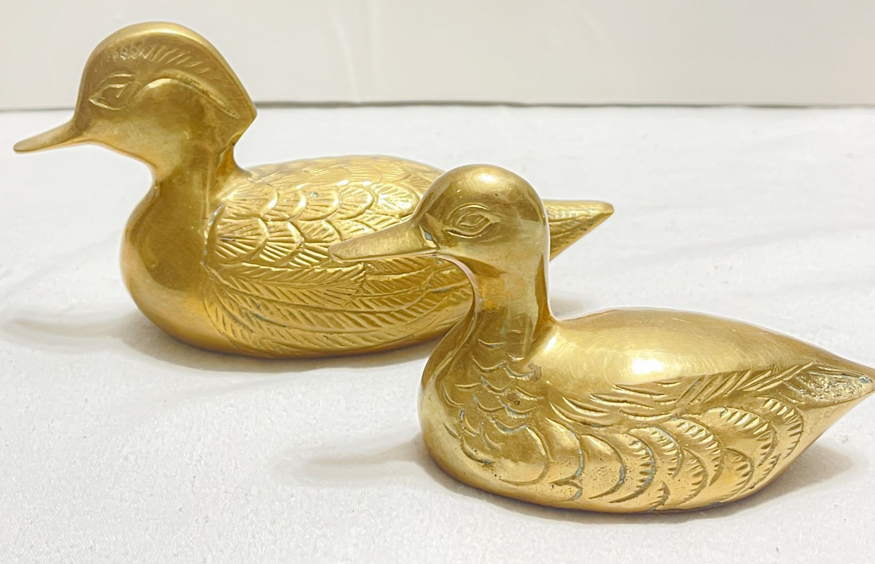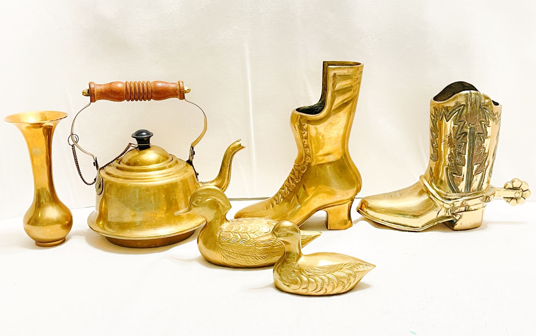 Charming mixed lot of vintage solid brass décor pieces. Includes a detailed pair of boot vases — one Victorian-style lace-up boot and one Western cowboy boot with spur detailing — both polished to a warm golden patina. The lot also features a classic brass teapot with turned wooden handle, a pair of matching brass ducks, and a simple fluted brass bud vase.