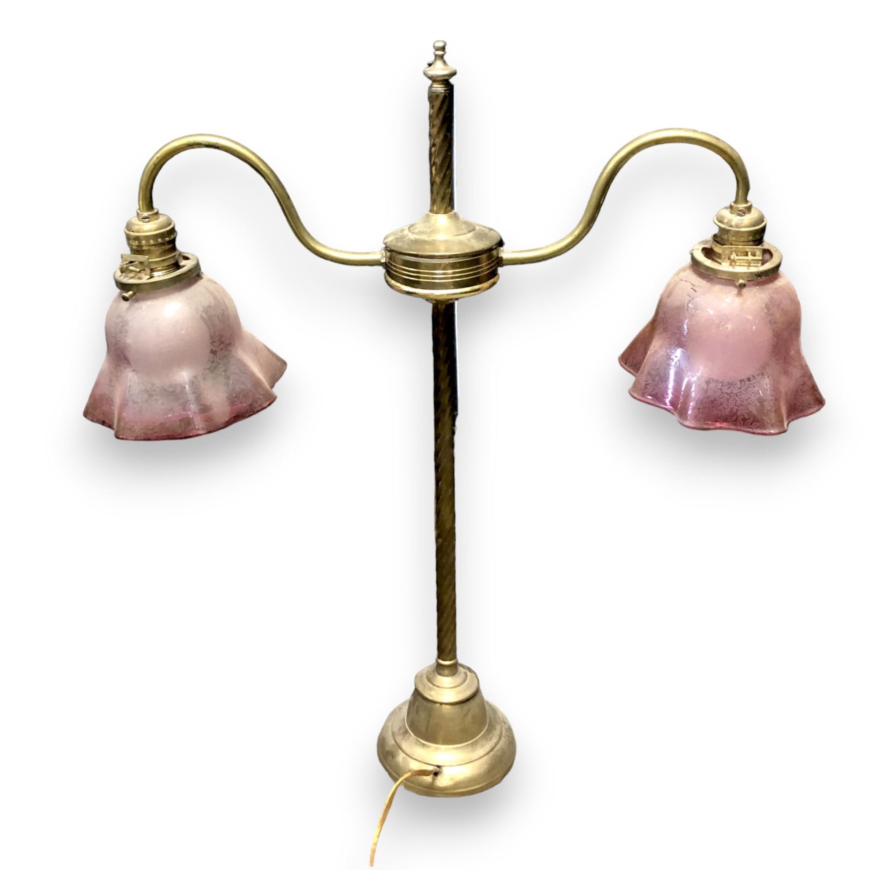Vintage Brass Dual Light Desk Top Lamp With Pink Engraved Shades