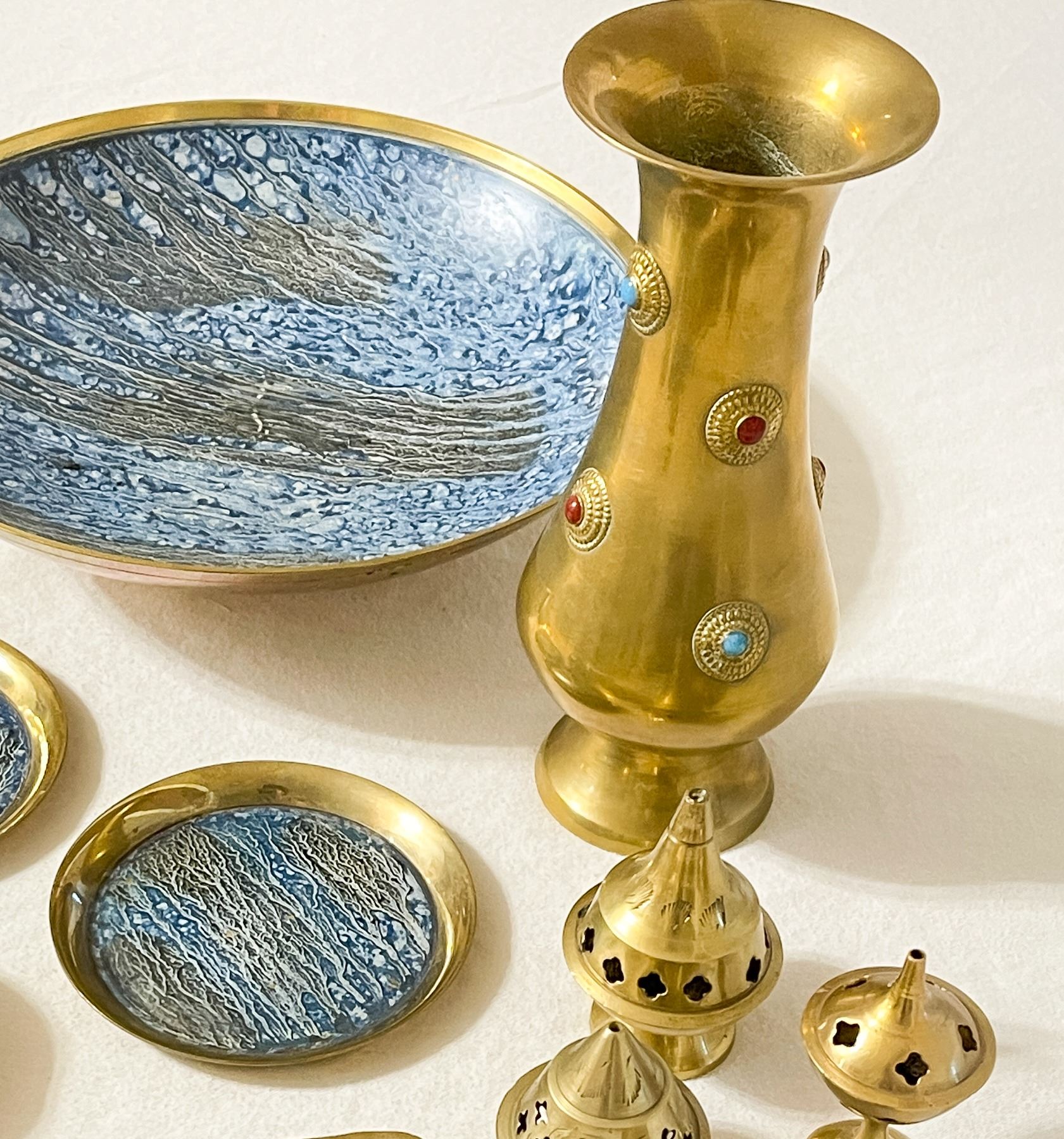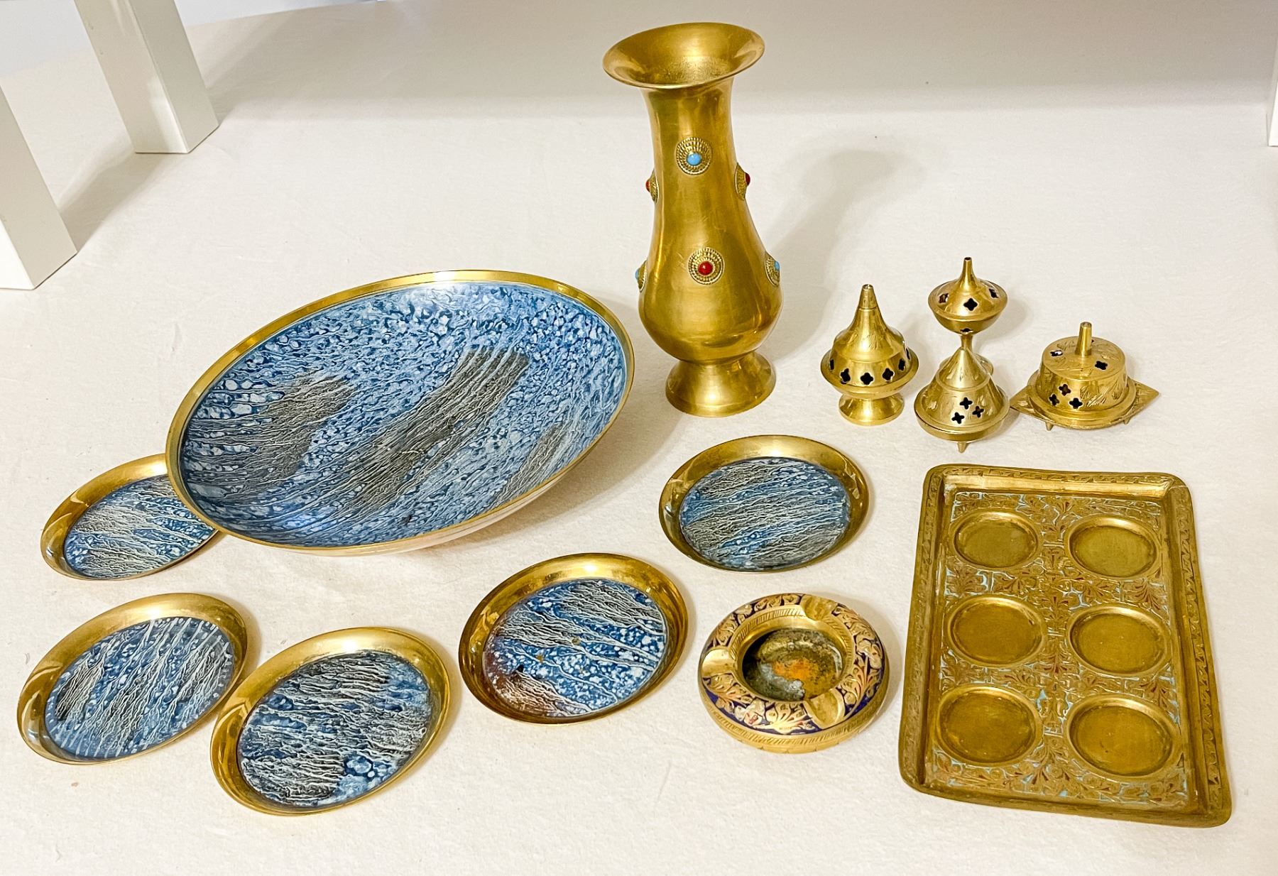 Vintage Brass Lot – German Enamel Bowl & Coasters, Jeweled Vase, Brass Incense Burners, Orn