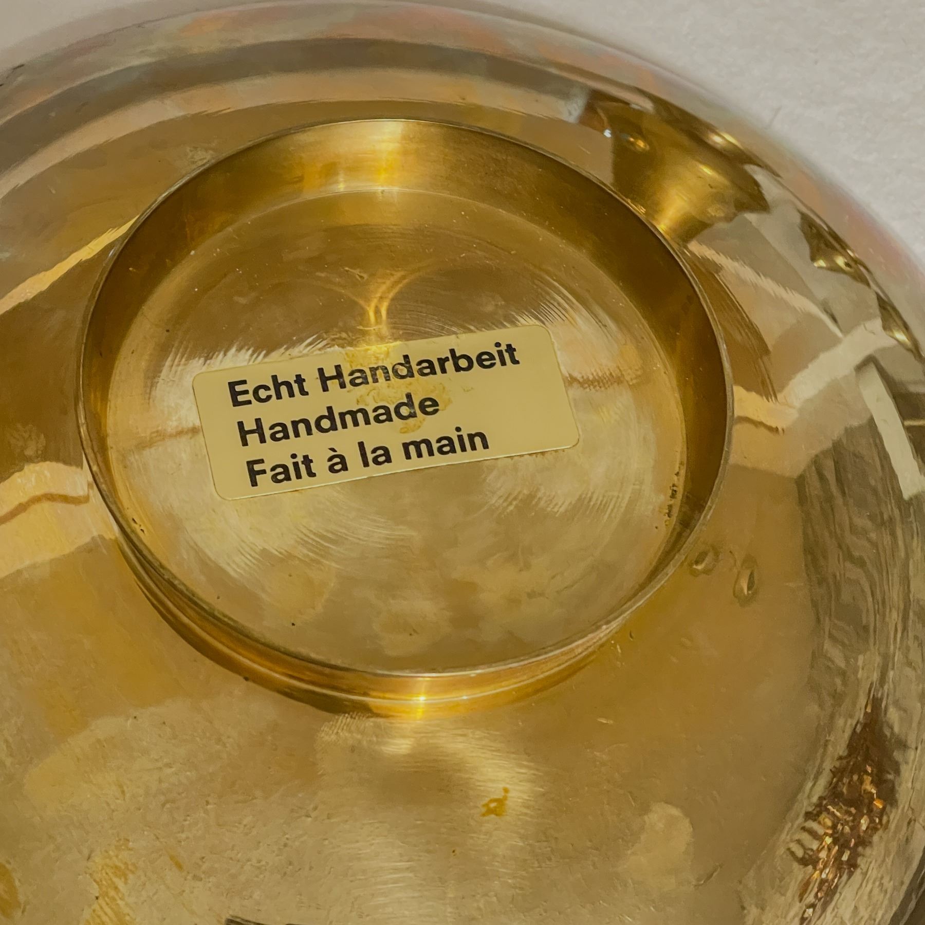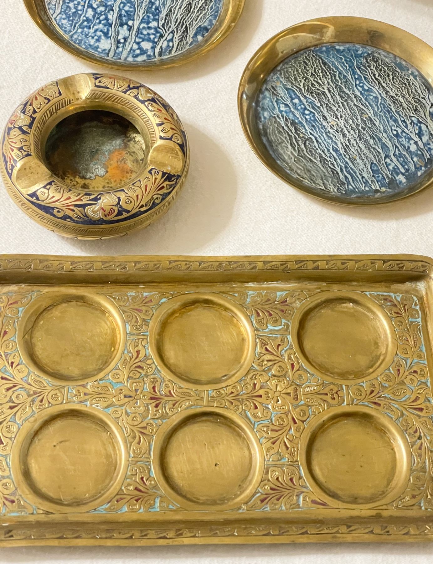 Mixed lot of vintage handmade brass décor. Includes a German enamel bowl with 6 matching coasters (all marked Echt Handarbeit), a tall brass vase decorated with colorful cabochon-style jewels, three lidded brass incense burners, a rectangular serving tray with ornate floral engravings, and a heavy enamel/brass ashtray with intricate detailing. Beautiful decorative and collectible set with unique handmade European and Middle Eastern-style pieces.