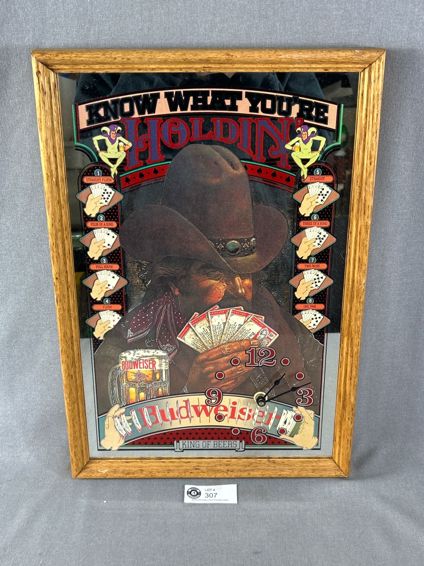 Vintage Budweiser Wood Framed Mirror Clock "Know What You're Holdin'" Approx. 13" x 9.5"