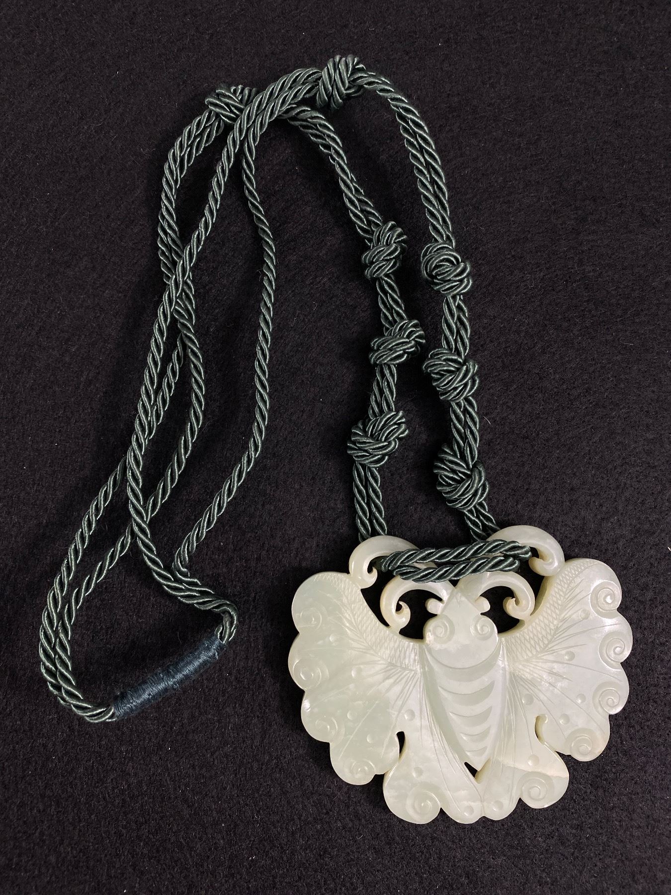 Vintage Butterfly Jade Pendant on Rope Necklace 3 x 3