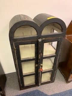 Vintage Cabinet with Glass Shelves - Unique Double Barrel Top - Painted Black - Approx. 24 x 12 x 44in with brass lion pulls