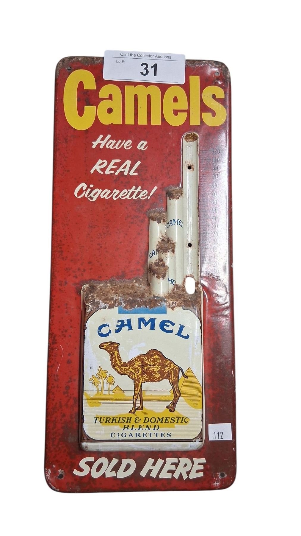 Vintage Camel embossed metal thermometer 13"x6", no glass