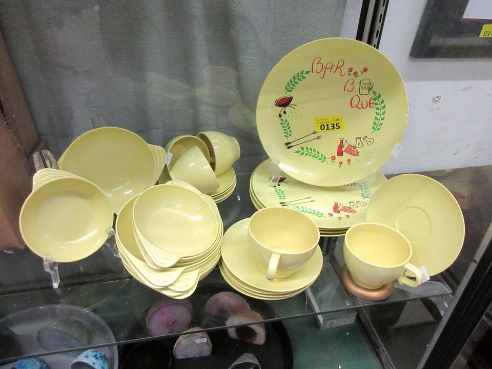 5 BBQ Plates, 4 teacups with 6 saucers, sugar bowl & 4 side plates, three 5" bowls, and six 6" bowls.