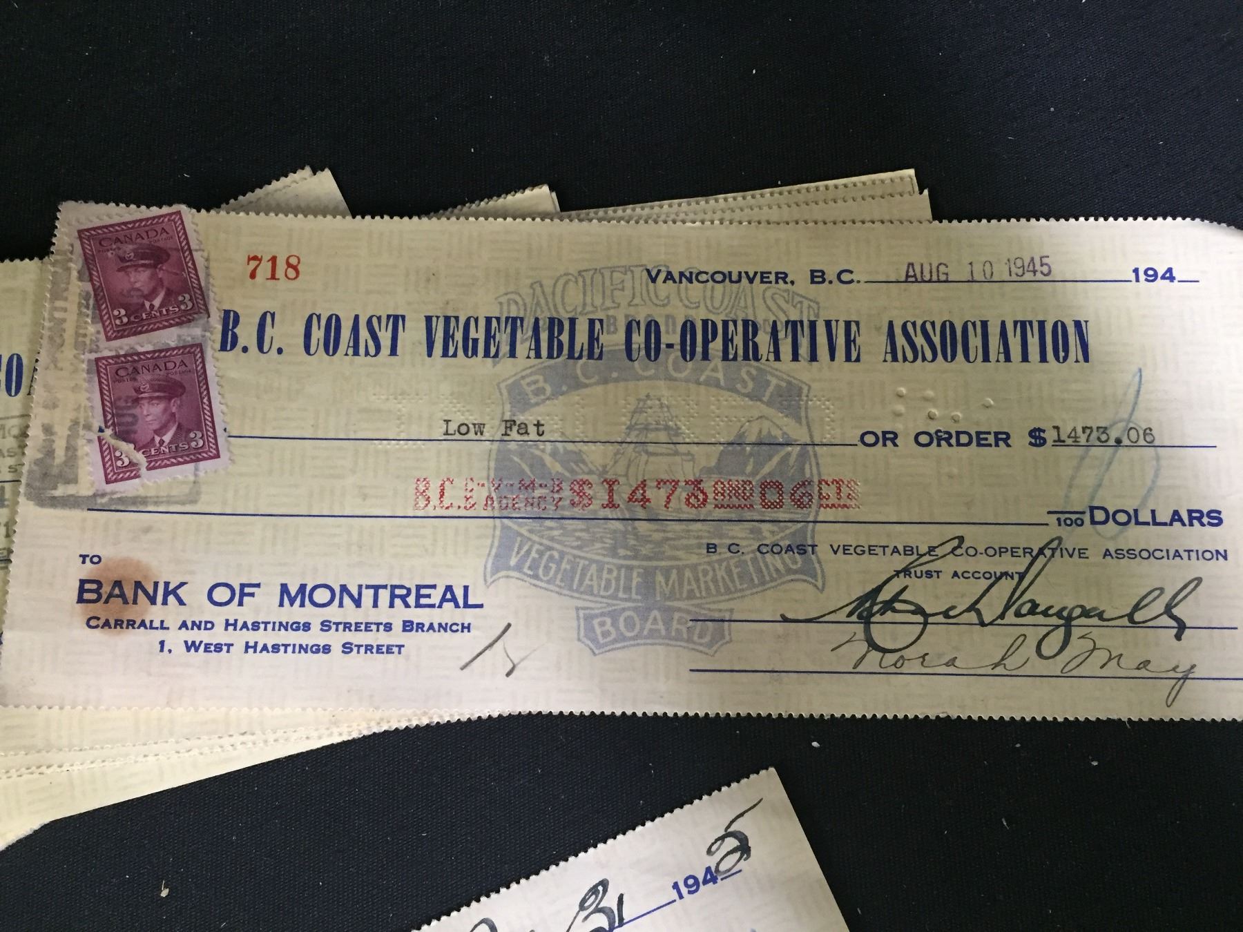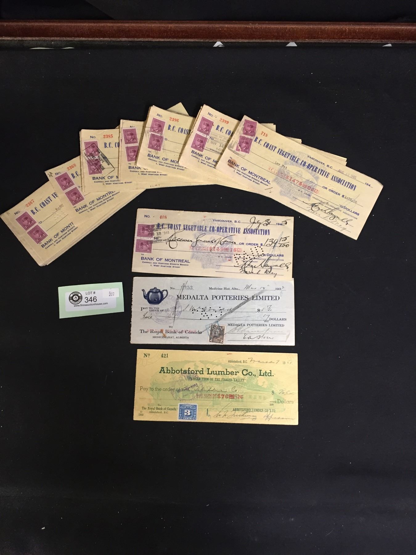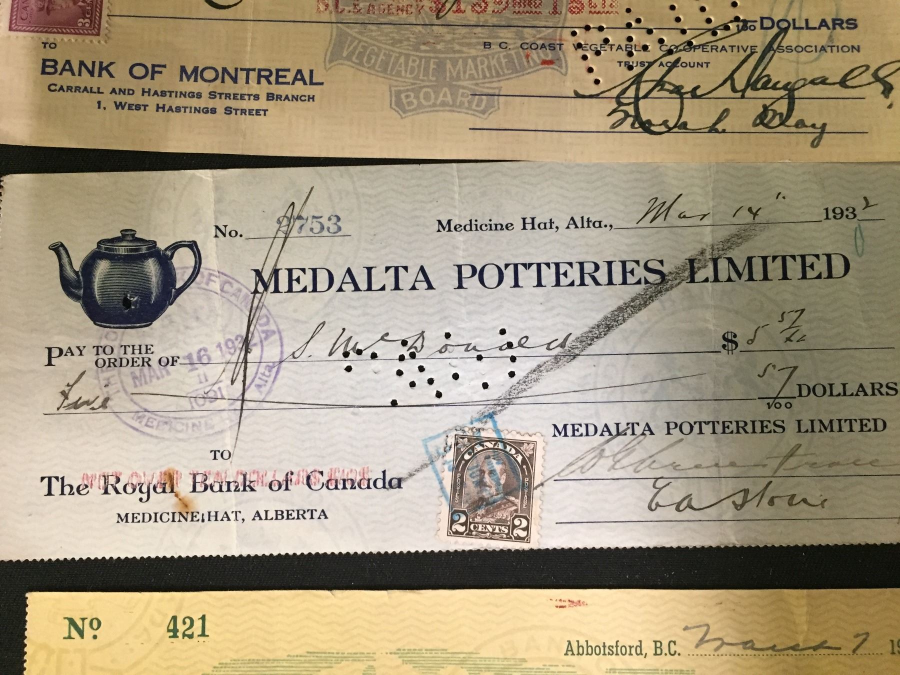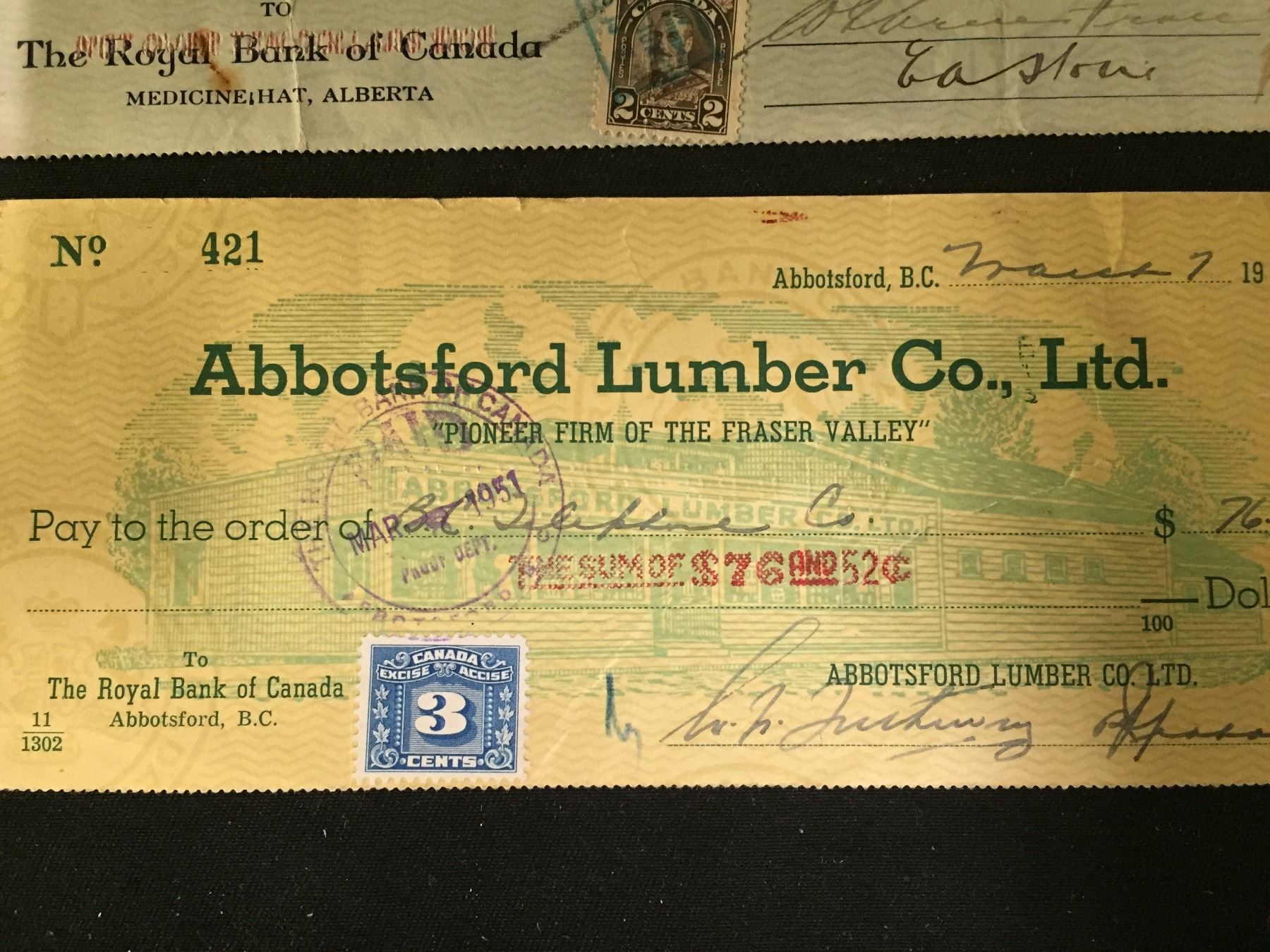 Vintage Cancelled Cheques with Stamps Abbotsford Lumber Co.,Medalta Potteries,BC Coast Vegetable Co-Op
