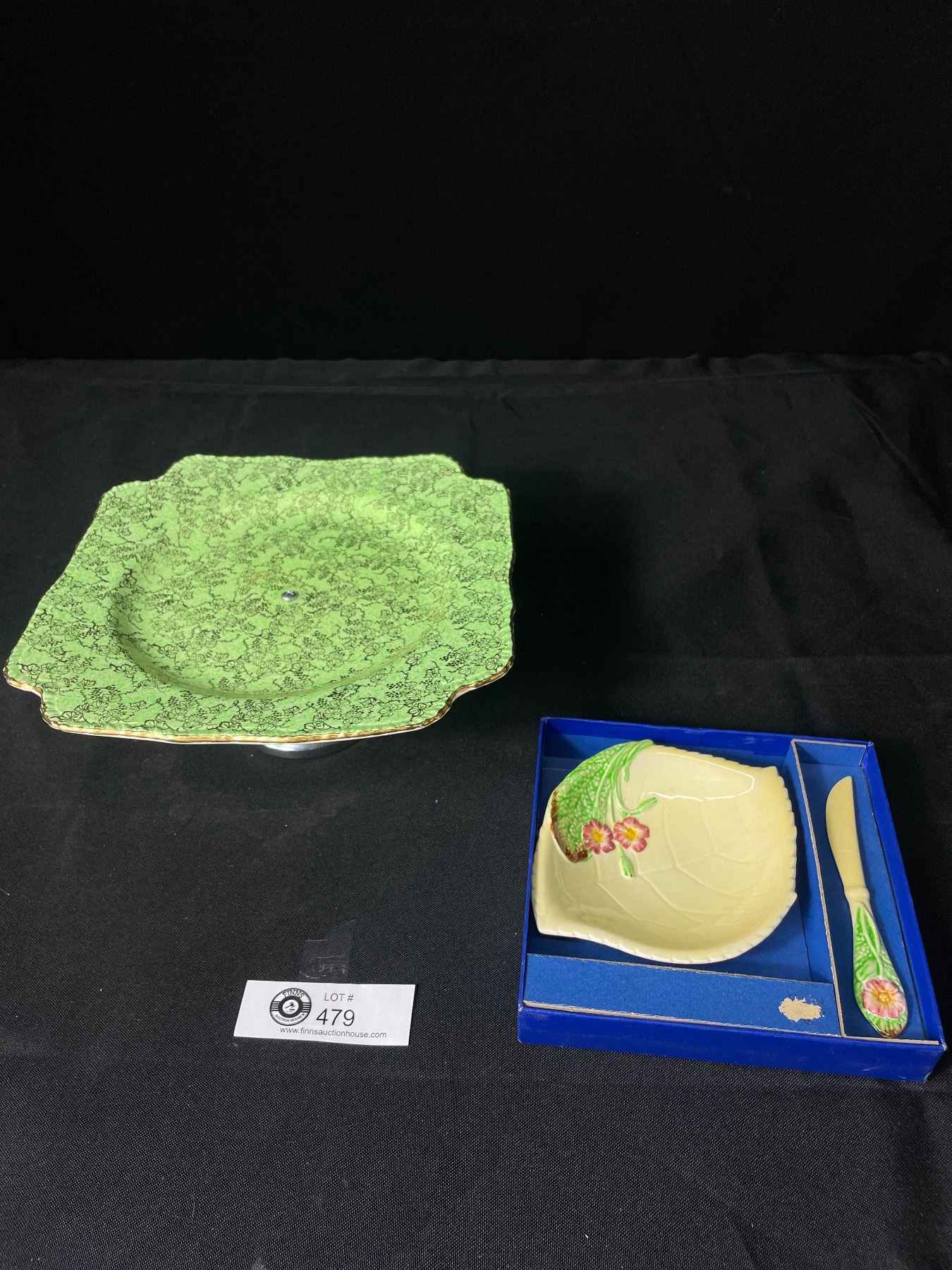 Vintage Carlton Ware England Dish with Knife in Box & English Porcelain Pedestal Cake Plate