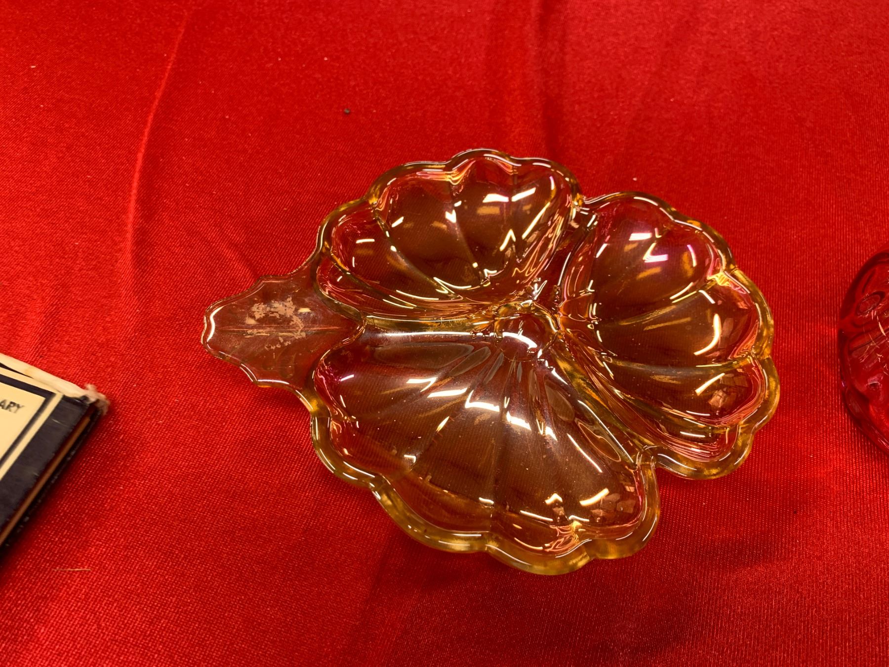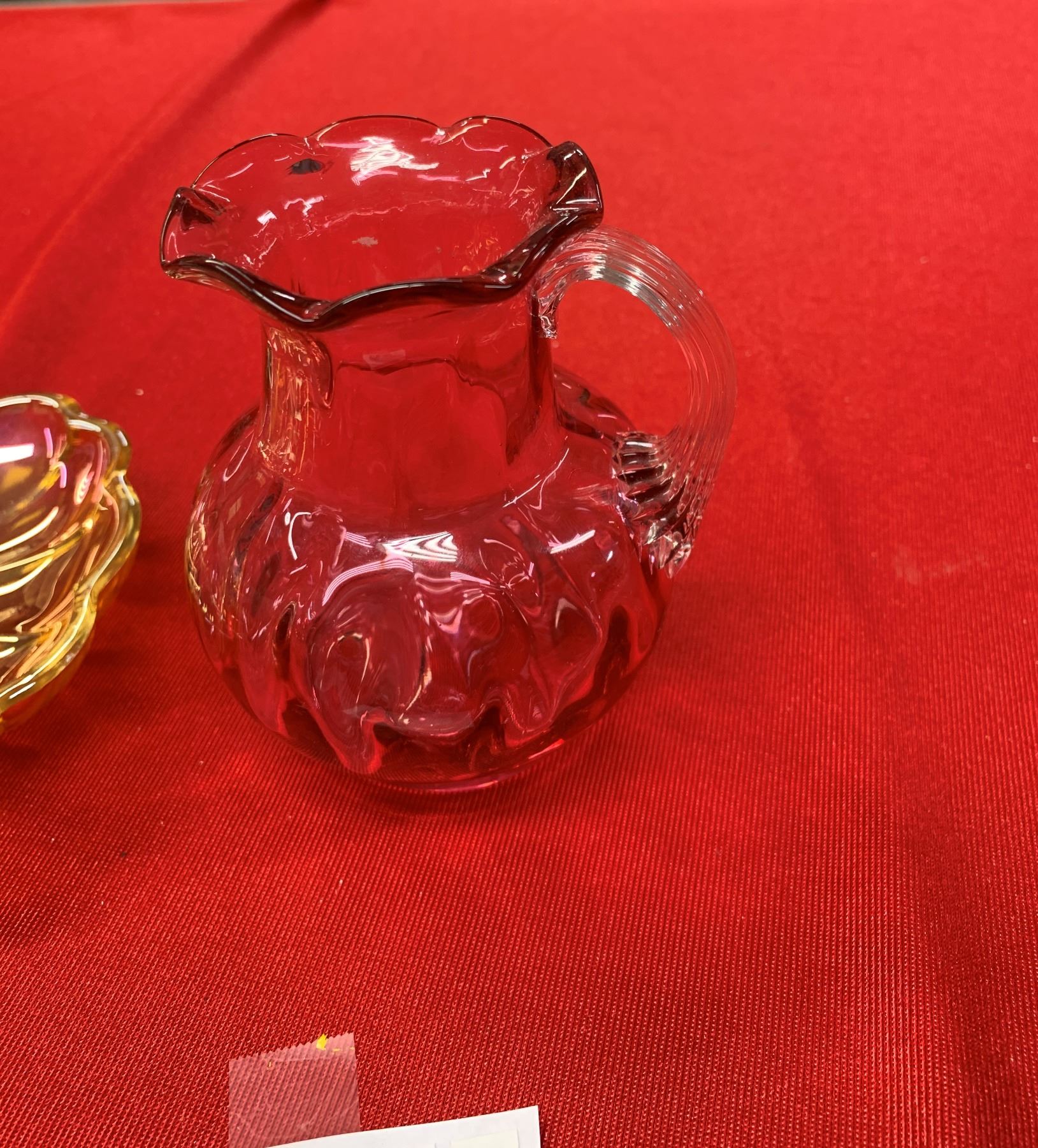 Vintage Carnival Glass Candy Dish Marigold and a Vintage Hand Blown Pink Pitcher with a Clear Handle
