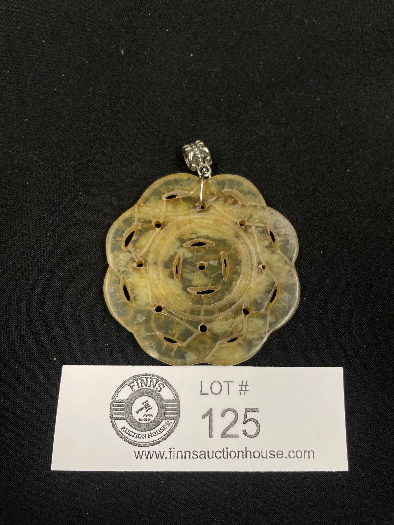 Vintage Carved Olive Green Stone Pendant, Small Damage on One Side