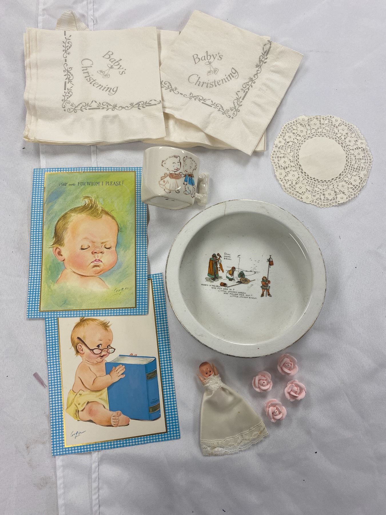 Vintage China Bowl, Edwin M Knowles China Co. with Cup and Vintage Baby Birth Announcement Items