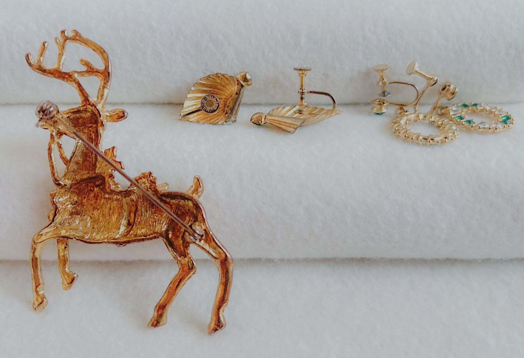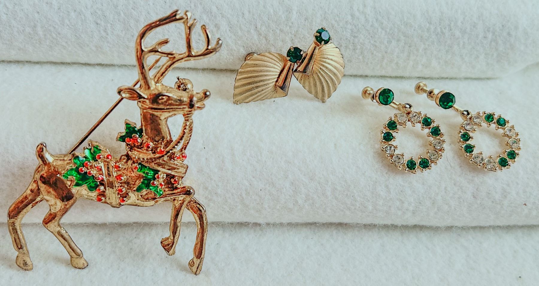 Festive vintage holiday set including a large reindeer brooch with red and green enamel, Bunn & Boyd sterling screw back earrings with gold wash and green stones, plus rhinestone wreath screw backs. Beautiful seasonal sparkle with classic mid-century charm.