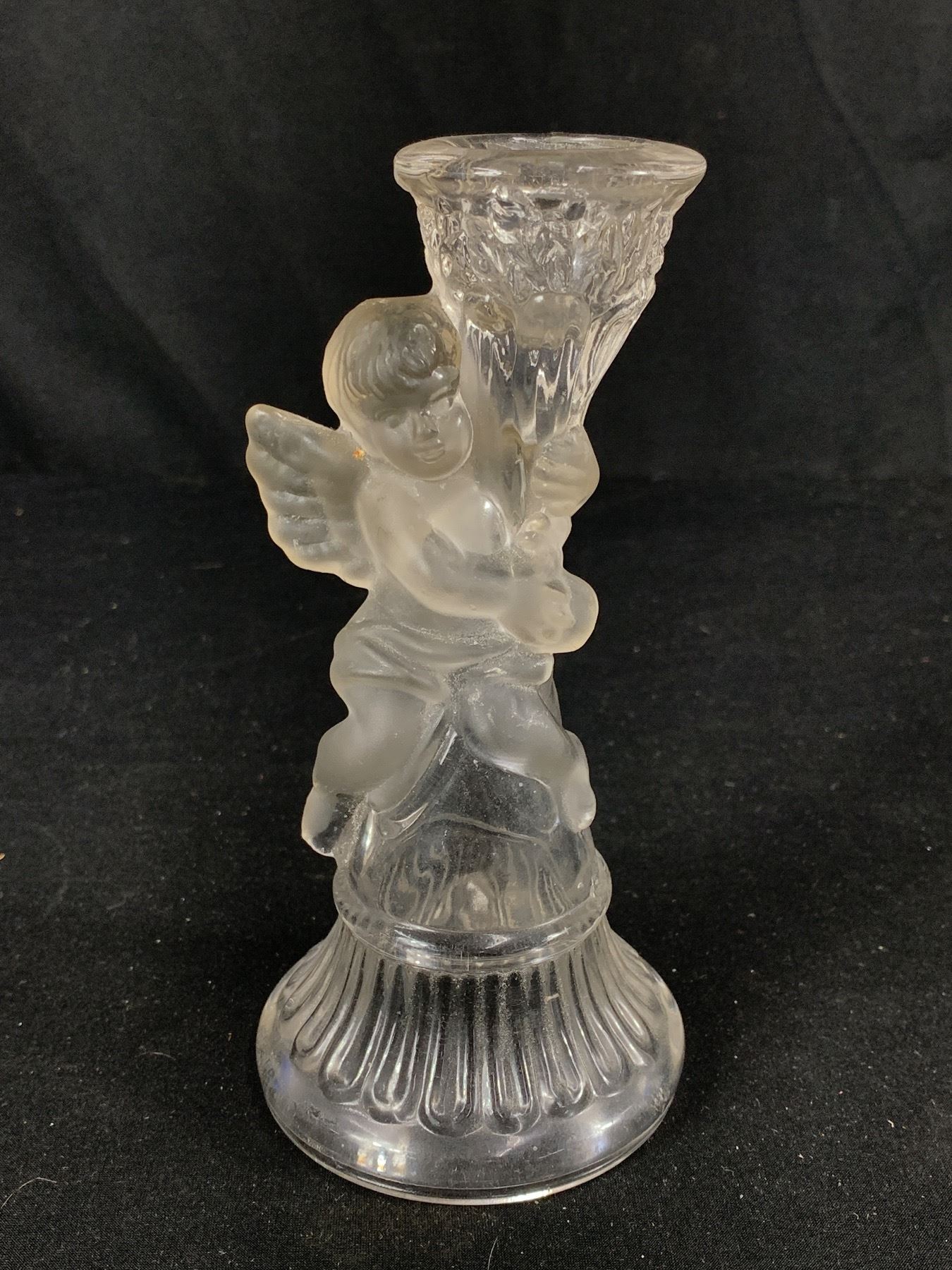 Vintage Clear Glass Horse and Carriage Planter, a Clear Glass Cupid Candle Holder and a set of 6 Opalescent Bowls with Gold Trim