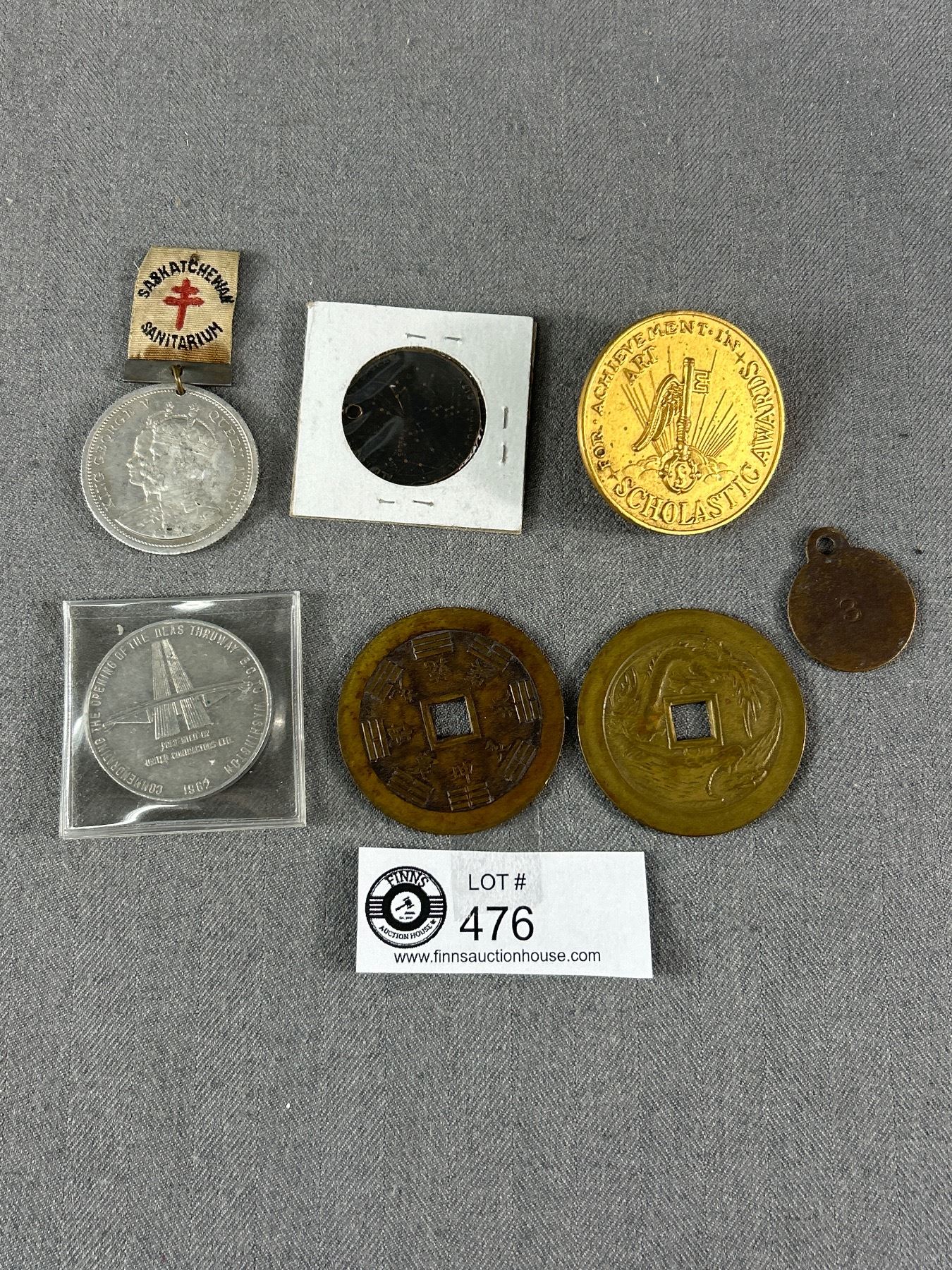 Vintage Coin Tokens - King George/Queen Mary Coin w/Saskatchewan Sanitarium Ribbon, Scholastic Award, Asian & More