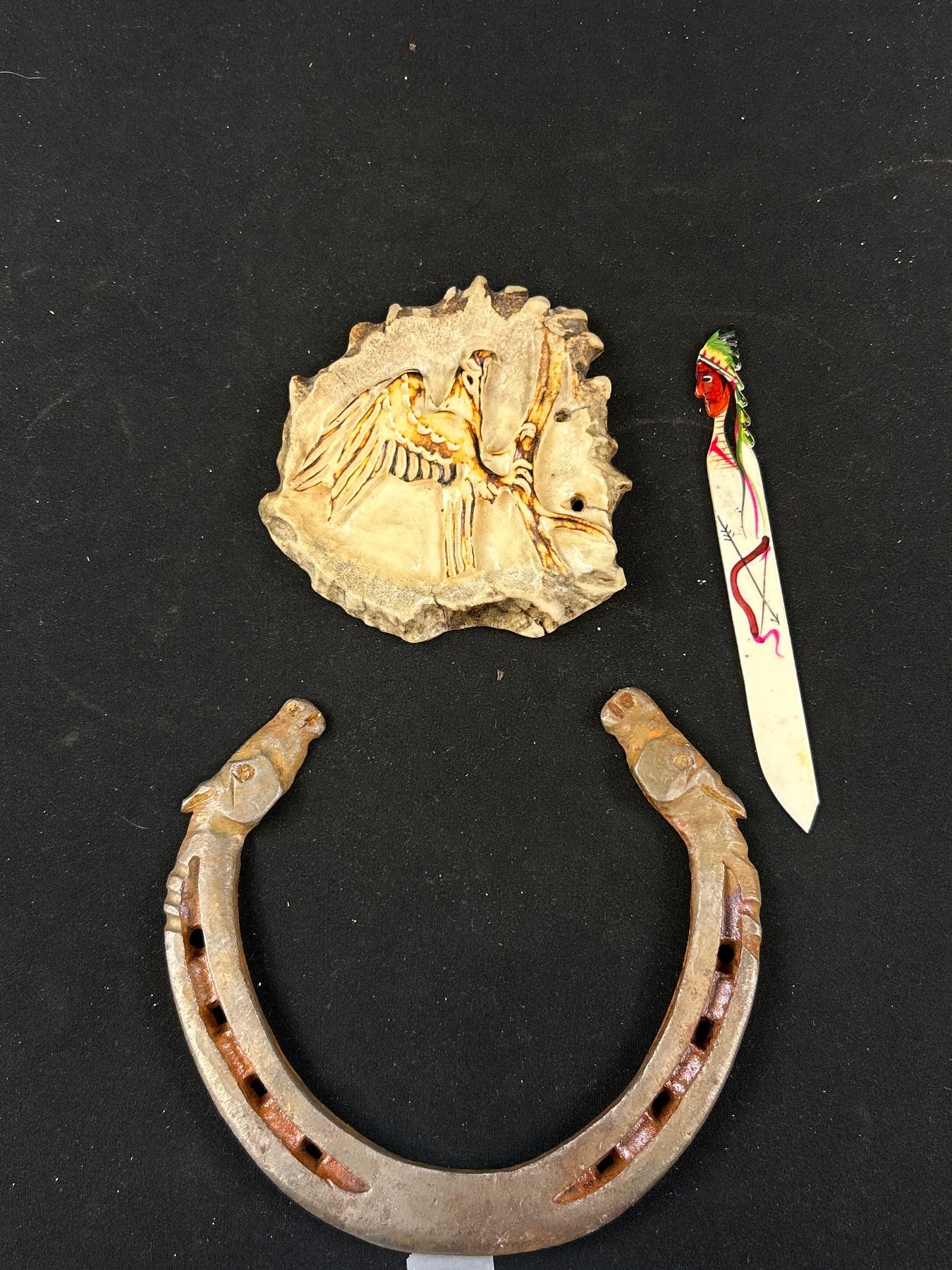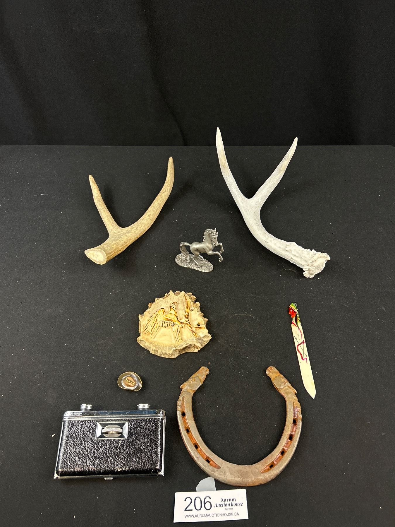 Vintage Collectible Lot - Carved Moose Antler, Indigineous Art, Pewter Horse, Horseshoe,etc
