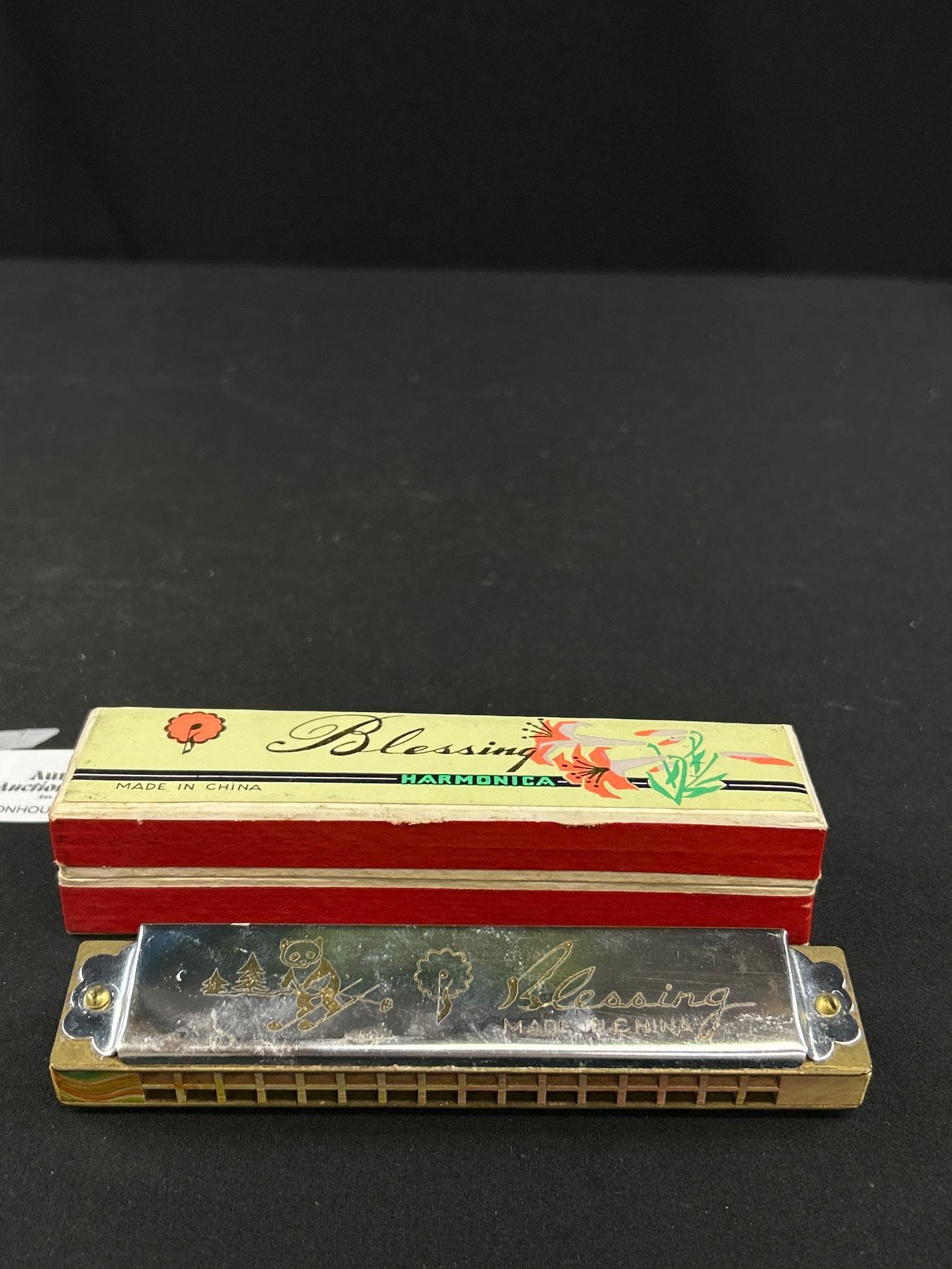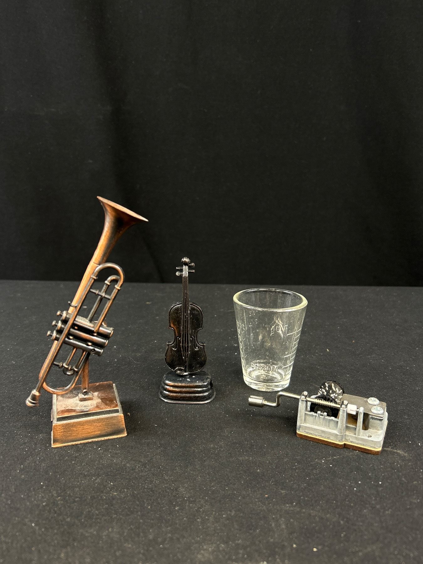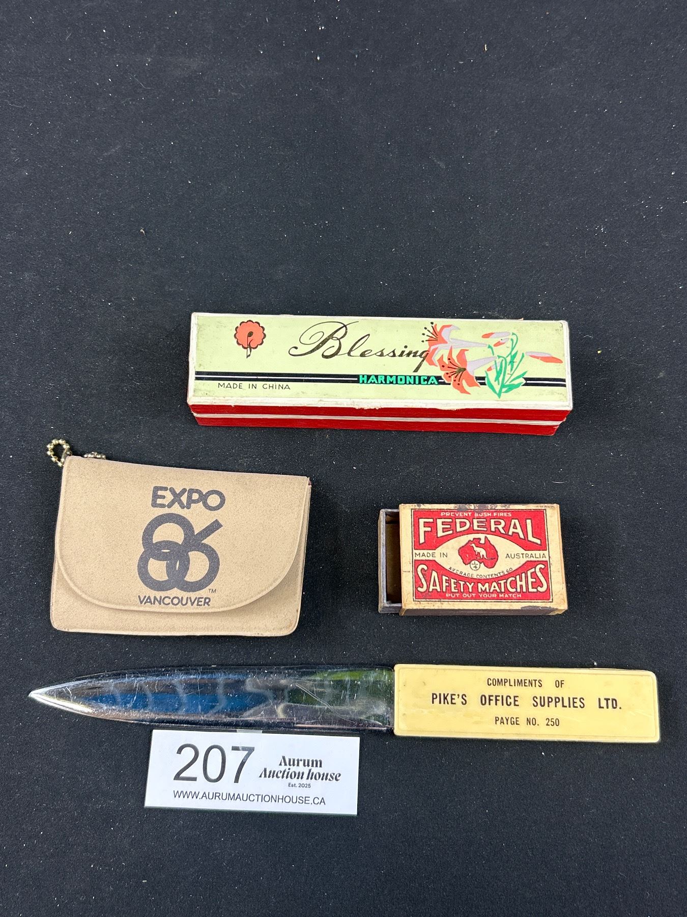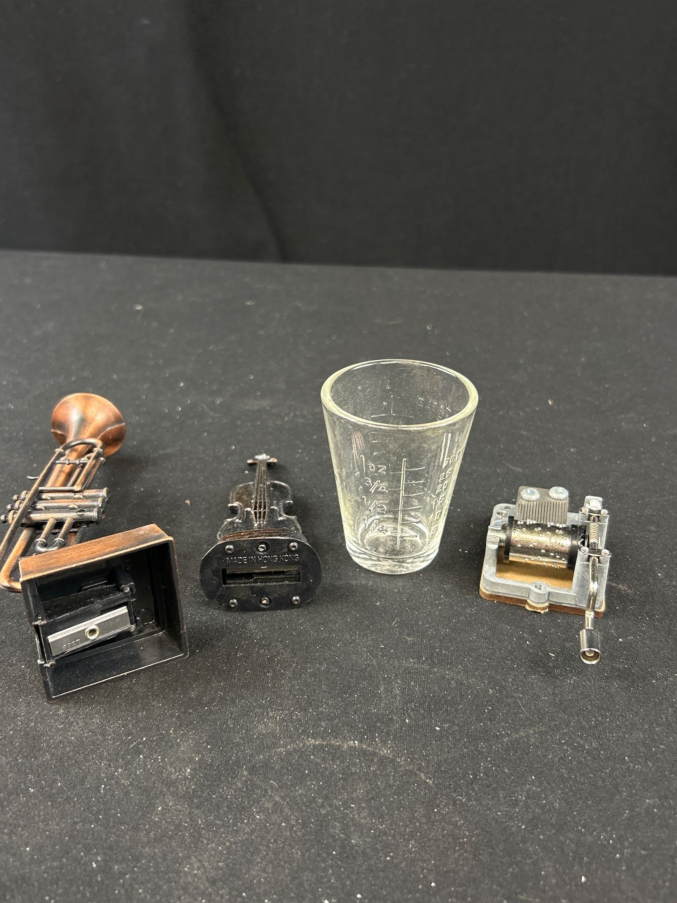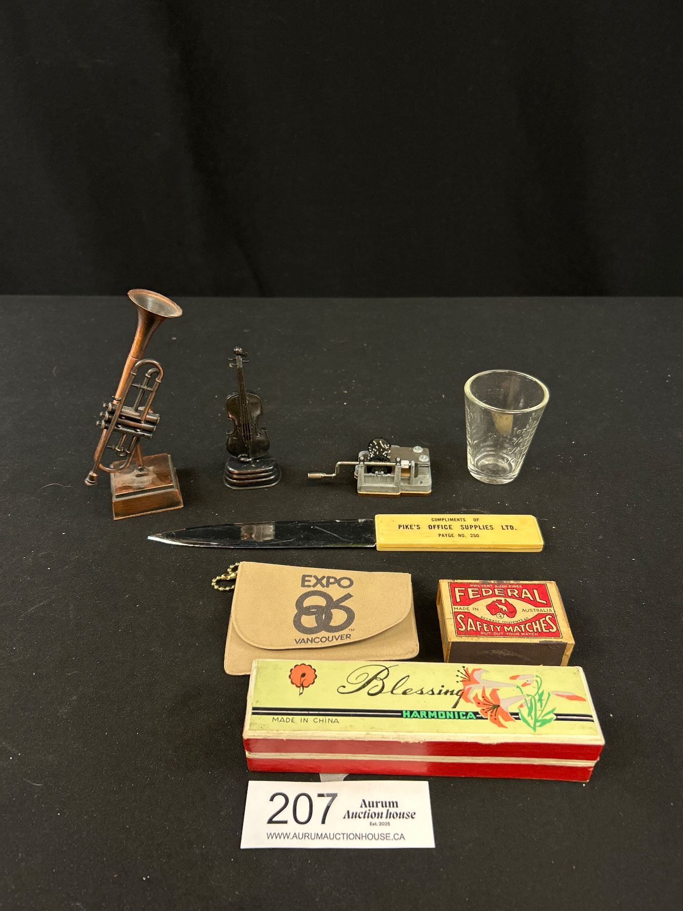 Vintage Collectible Lot - Harmonica, Sharpeners, Letter Opener, Pharmacutical Measure Cup and More